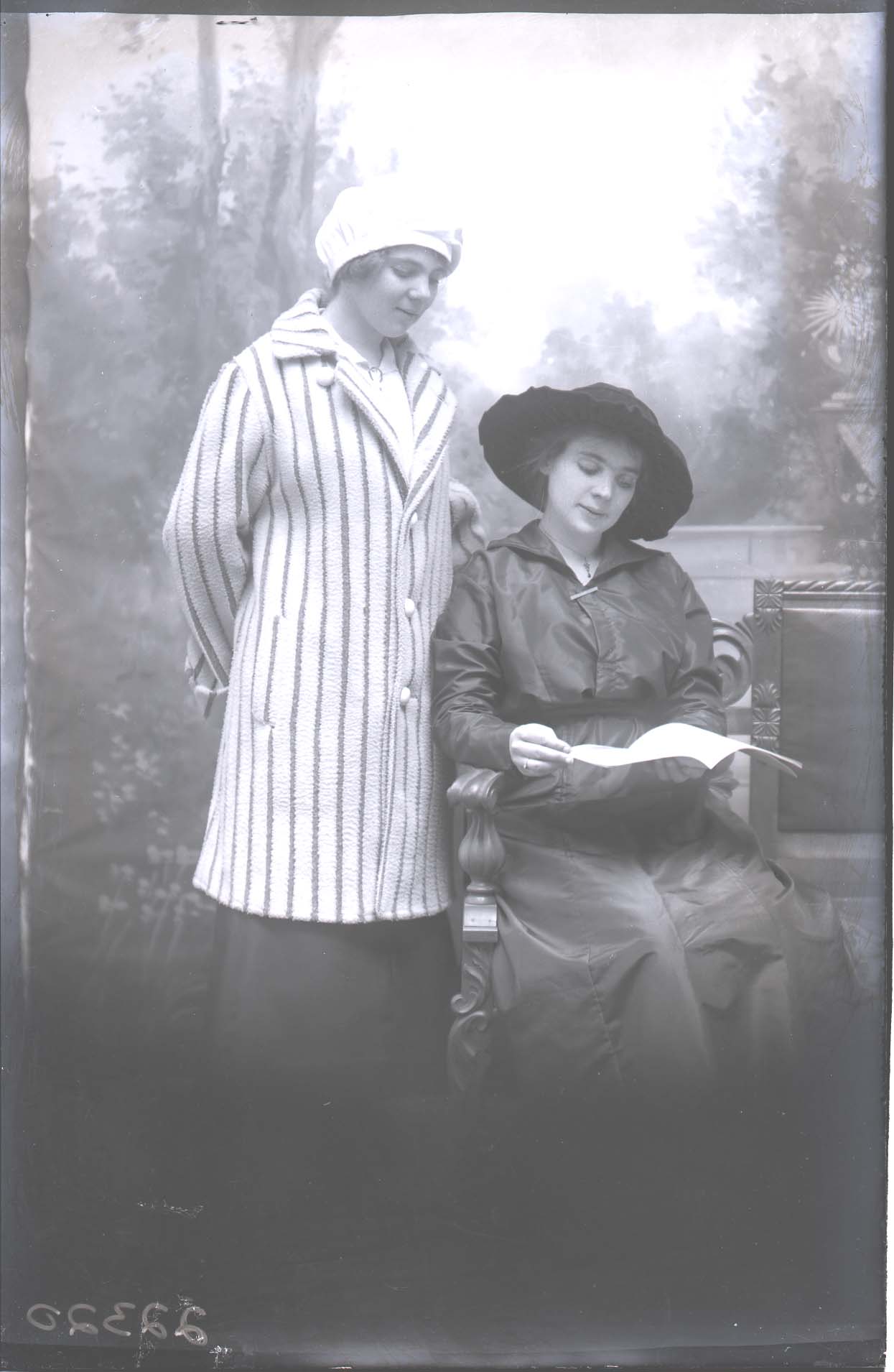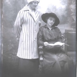 Two unidentified women, one seated holding an open book and the other standing beside her looking on.