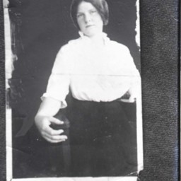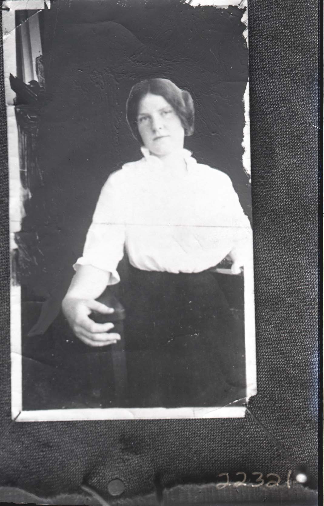 Photo of a photograph of an unidentified woman wearing a blouse and skirt.