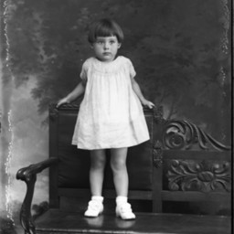 Unidentified young girl with short hair and bangs is standing on a bench.