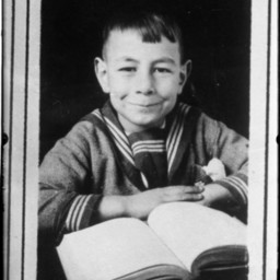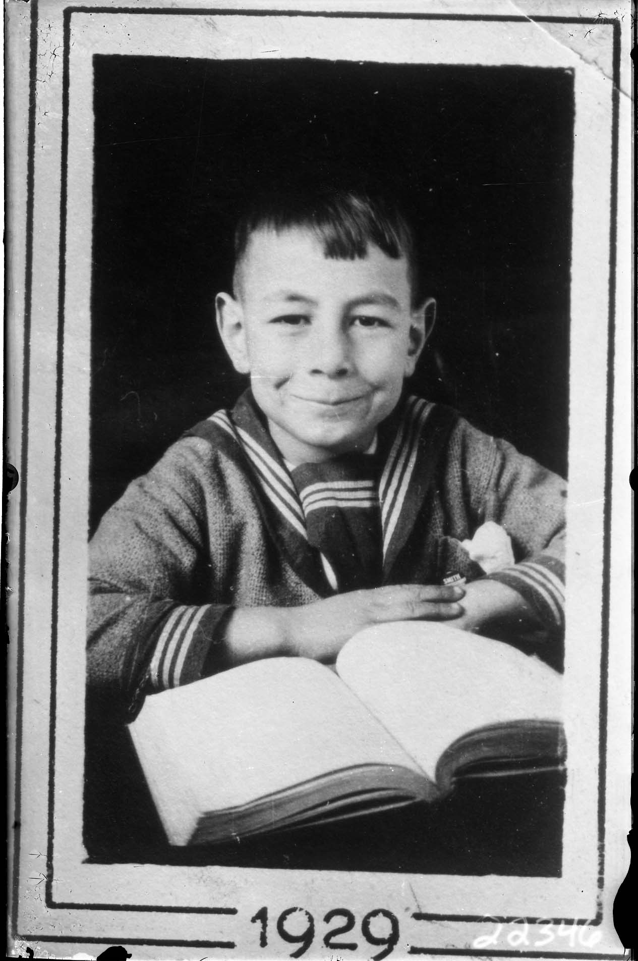 Photo of a framed school portrait photograph of an unidentified boy smiling with an open book before him.