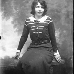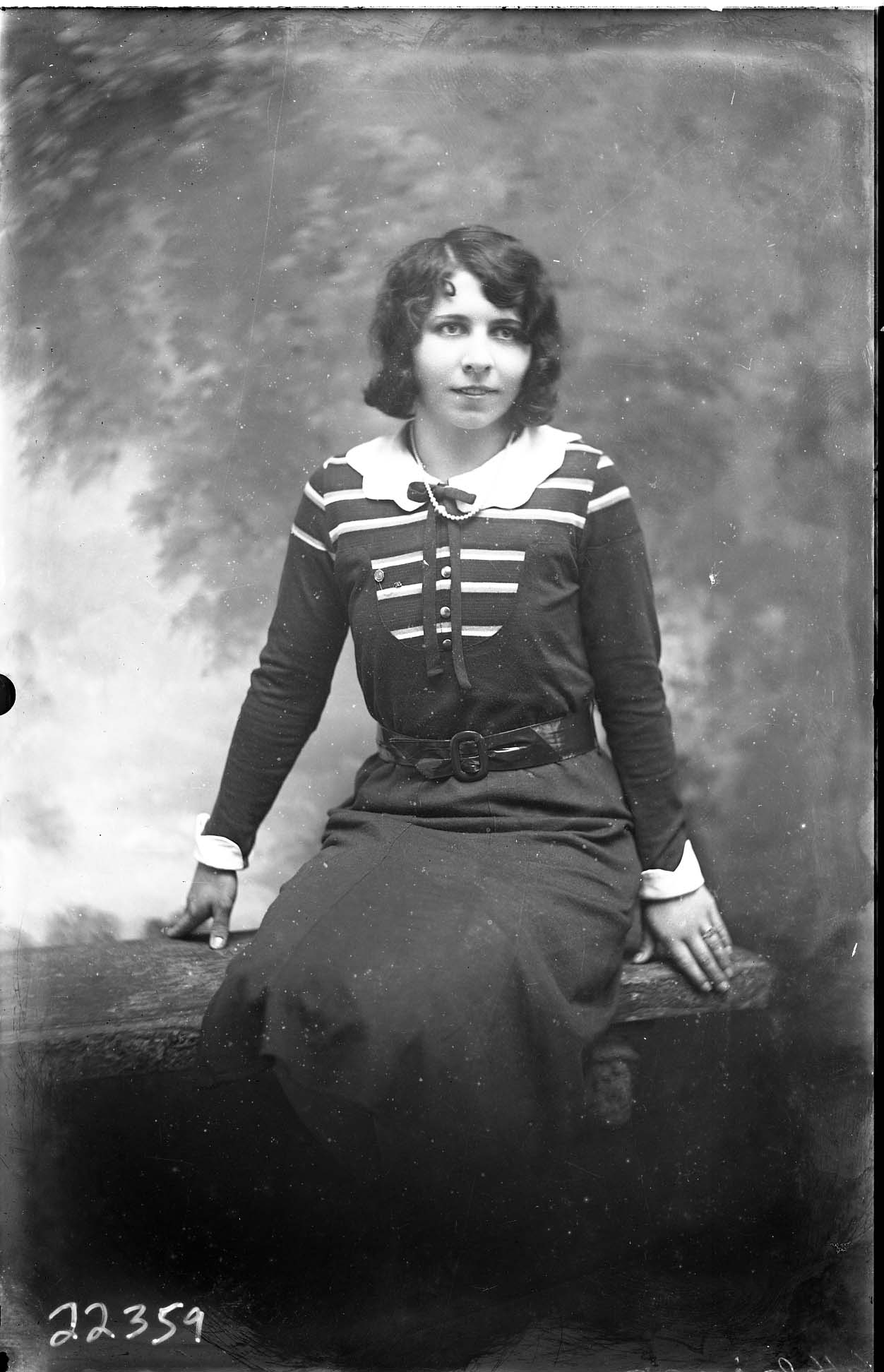 Unidentified woman, seated, with short hair, is wearing a necklace and a bow on the front of her long-sleeved dress.