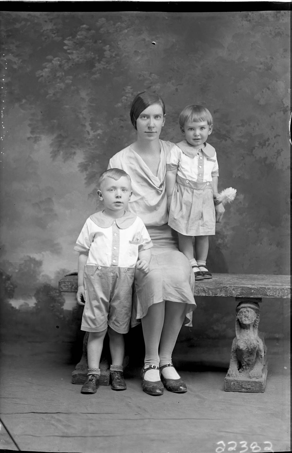 Unidentified woman is seated on a bench with an unidentified child on either side of her.