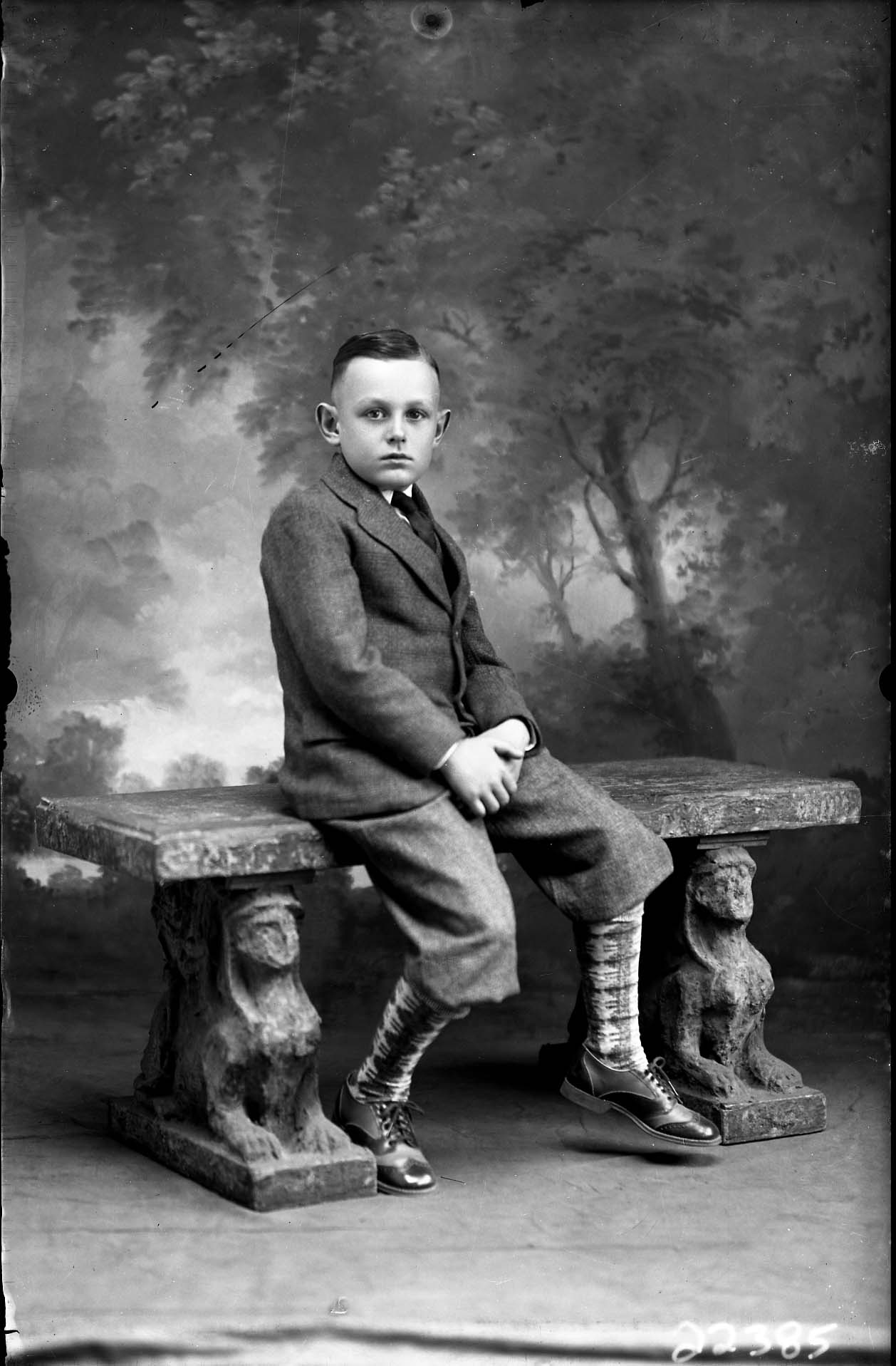 Unidentified boy in a suit and tie with short pants is seated on a bench.
