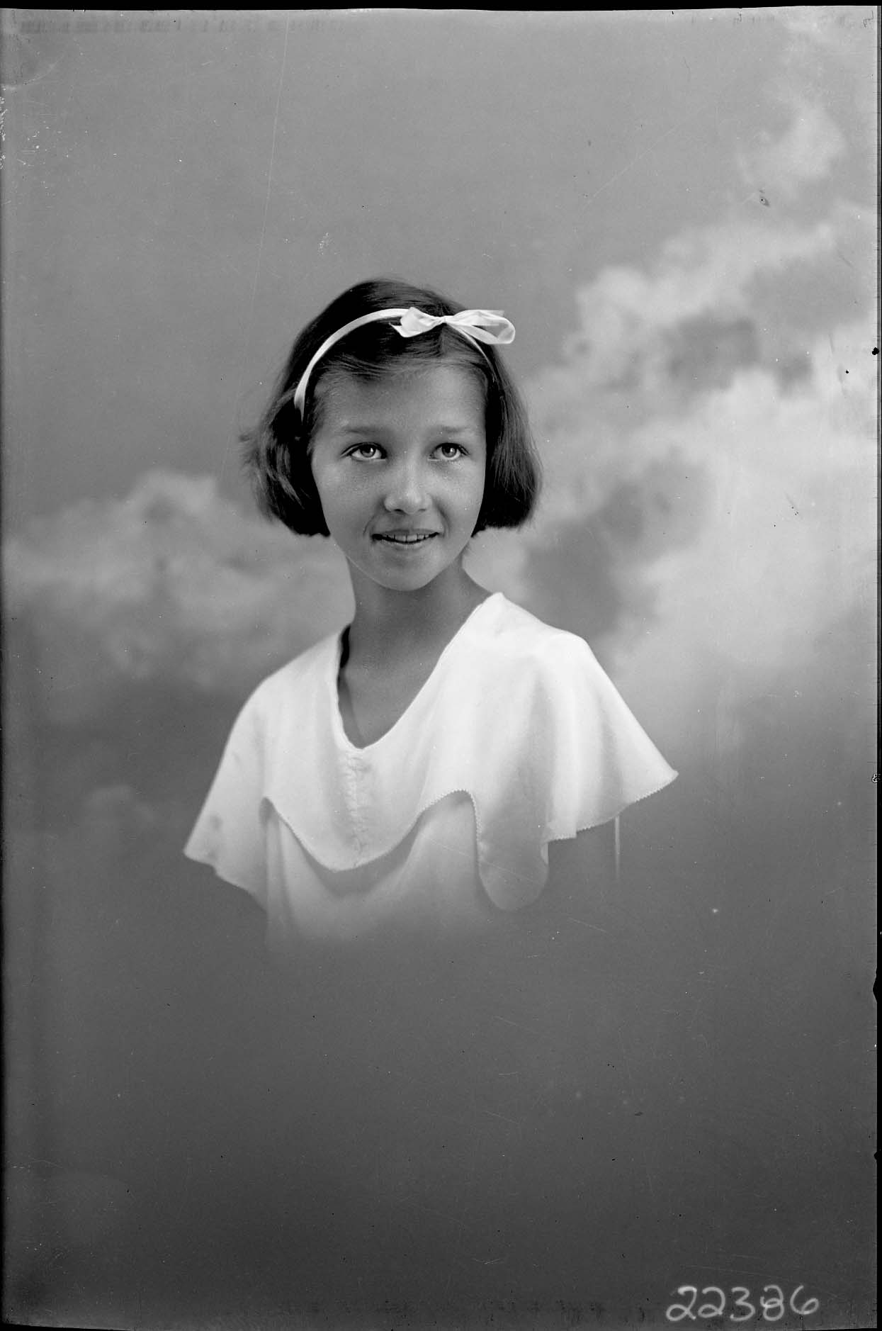 Portrait photograph of an unidentified girl wearing a ribbon with a bow tied in her short hair.