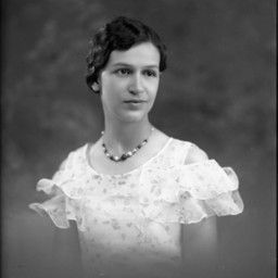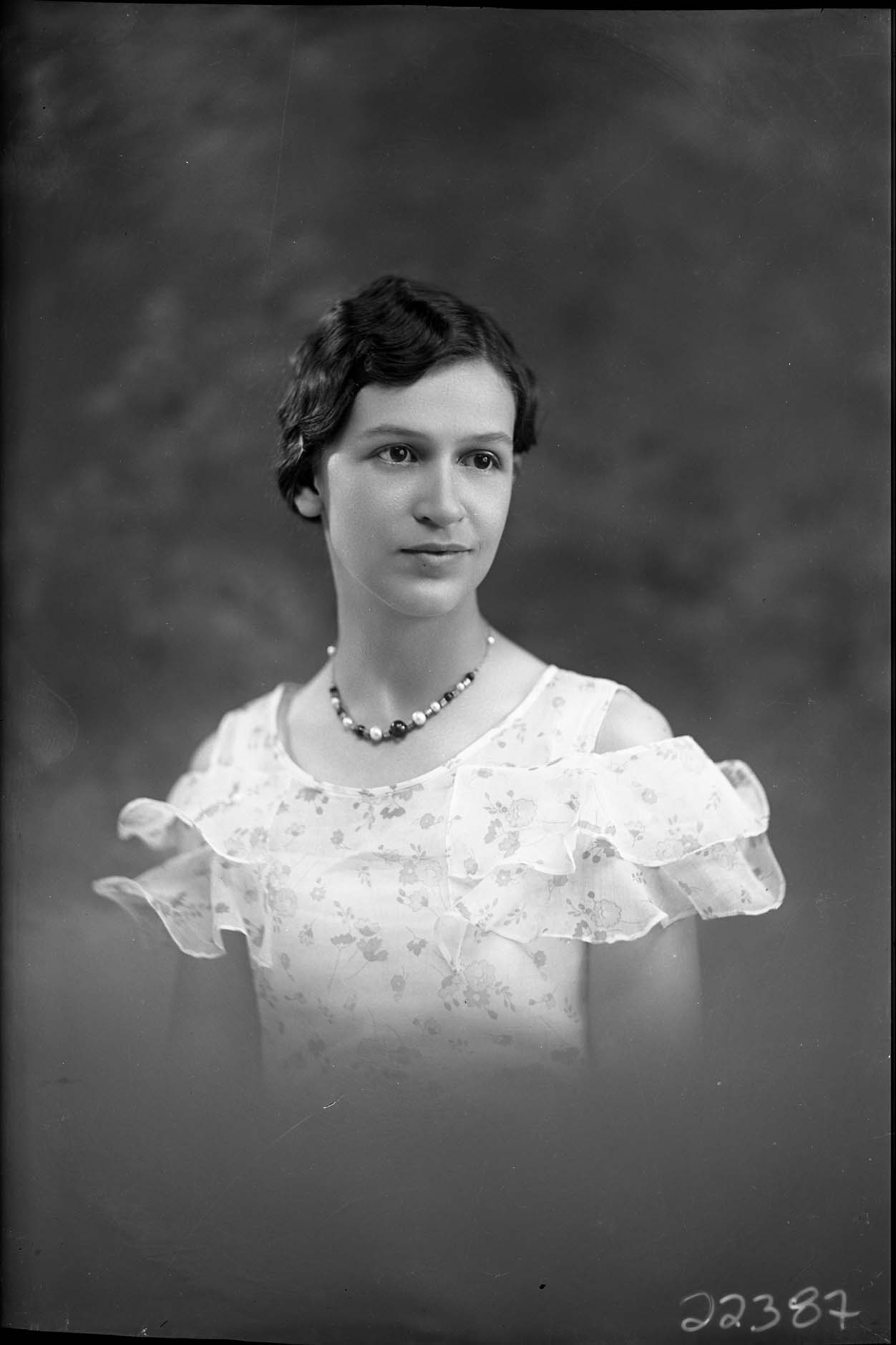 Portrait photograph of an unidentified young woman with her hair pulled back and wearing a necklace with her dress.