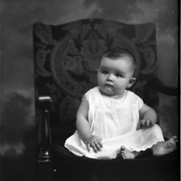 Unidentified barefoot young child is seated on a chair.