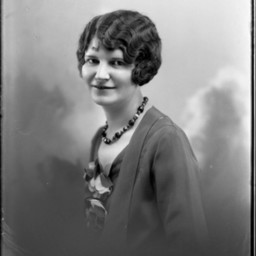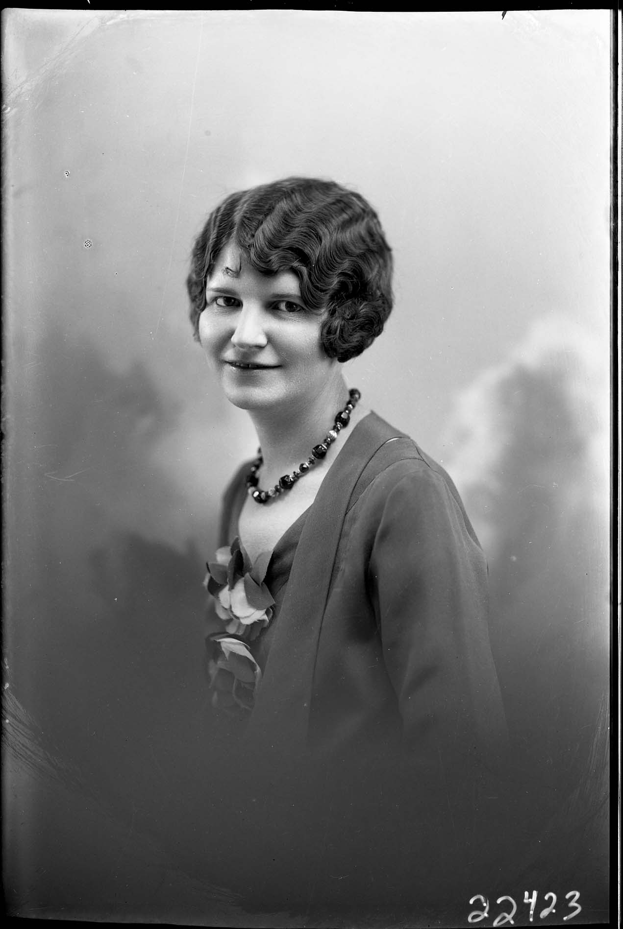 Portrait photograph of an unidentified woman with short wavy hair and wearing a bead necklace with her outfit.
