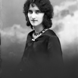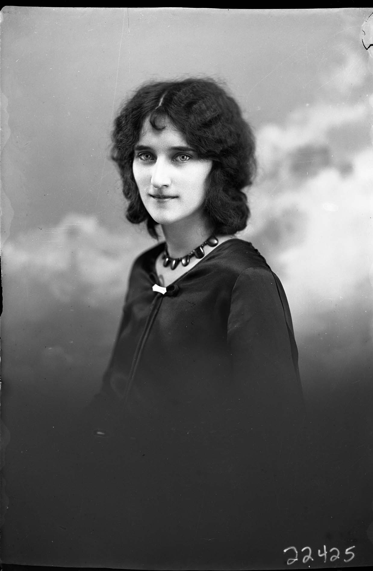 Portrait photograph of an unidentified young woman with dark hair and styled with a single curl on her forehead.