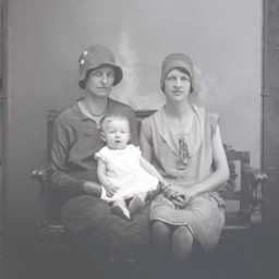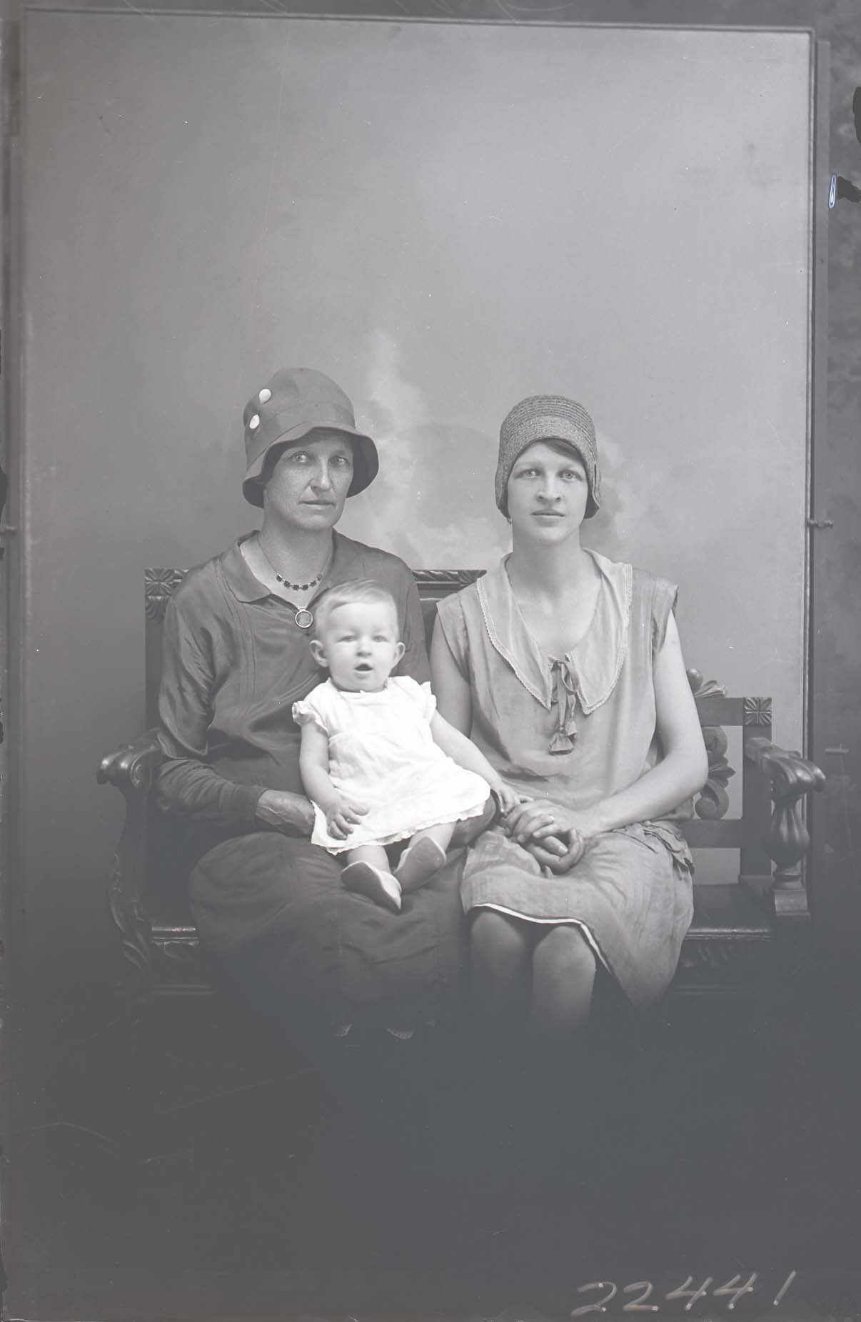 Two unidentified adult women in hats, are seated on a bench with an unidentified young child posed on one of the women's laps.
