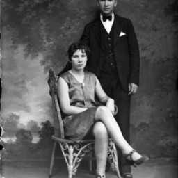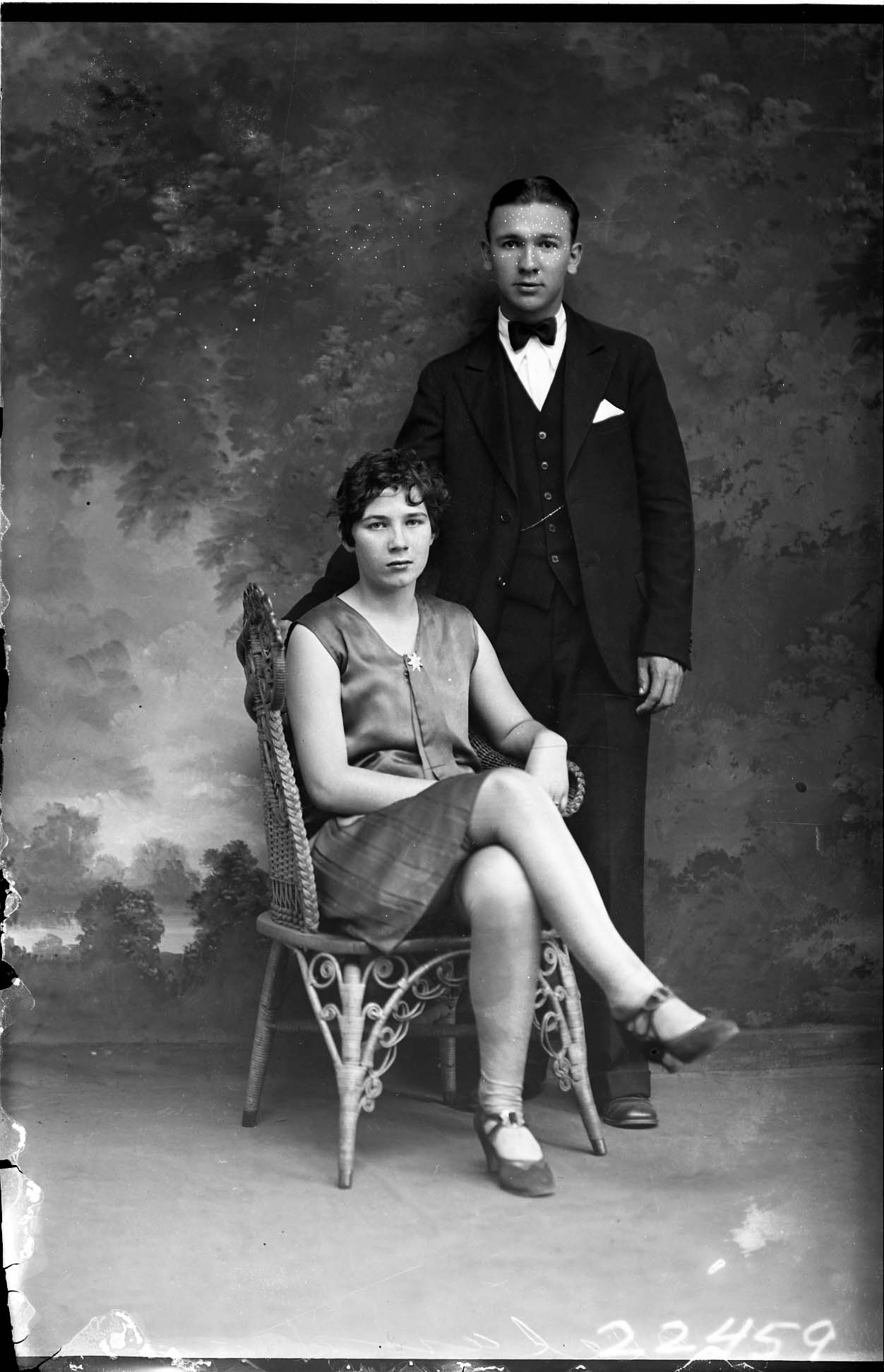 Unidentified young woman with short hair is seated in a wicker chair with her legs crossed. An unidentified young man in a suit and bow tie is standing beside her.