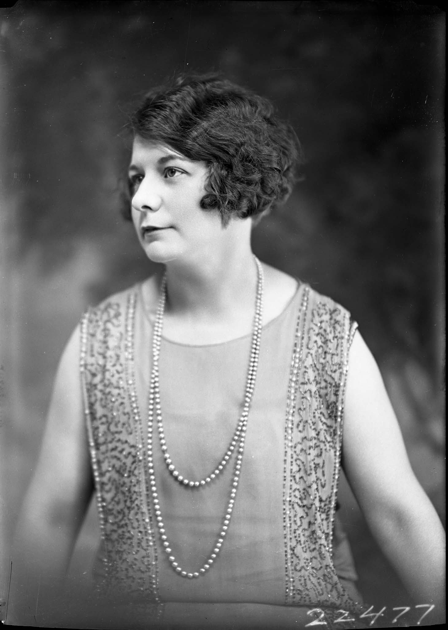 Portrait photograph of an unidentified woman with short hair and wearing two long strands of faux pearls with her dress.