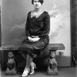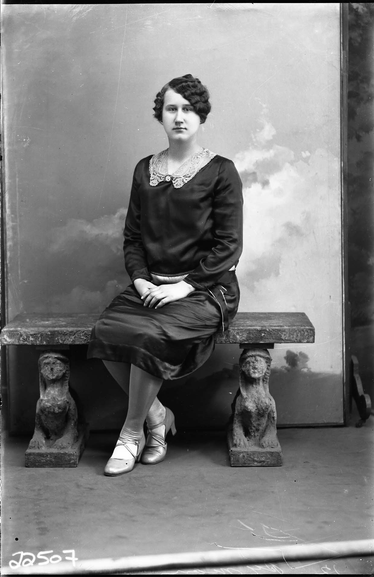 Unidentified woman with short wavy hair is seated on a stone bench with her hands in her lap and her ankles crossed.