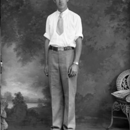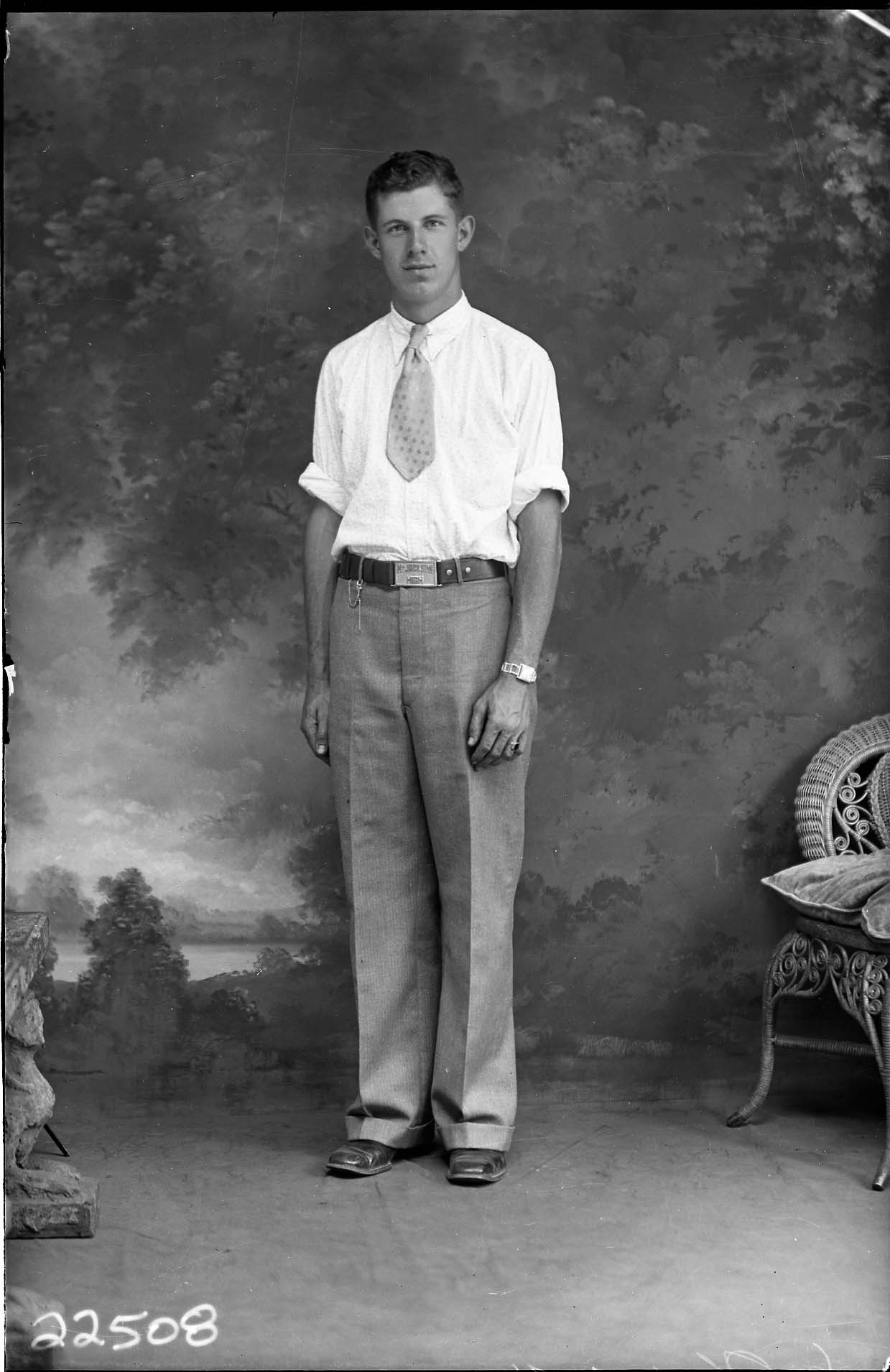 Unidentified man standing with his arms at his sides and wearing a tie and a shirt with rolled-up sleeves. The words, "Mt. Jackson High" are on his belt buckle.
