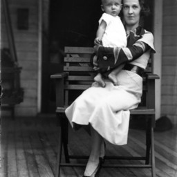 Unidentified woman with short hair is seated on a porch and holding an unidentified barefoot young child in her arms.