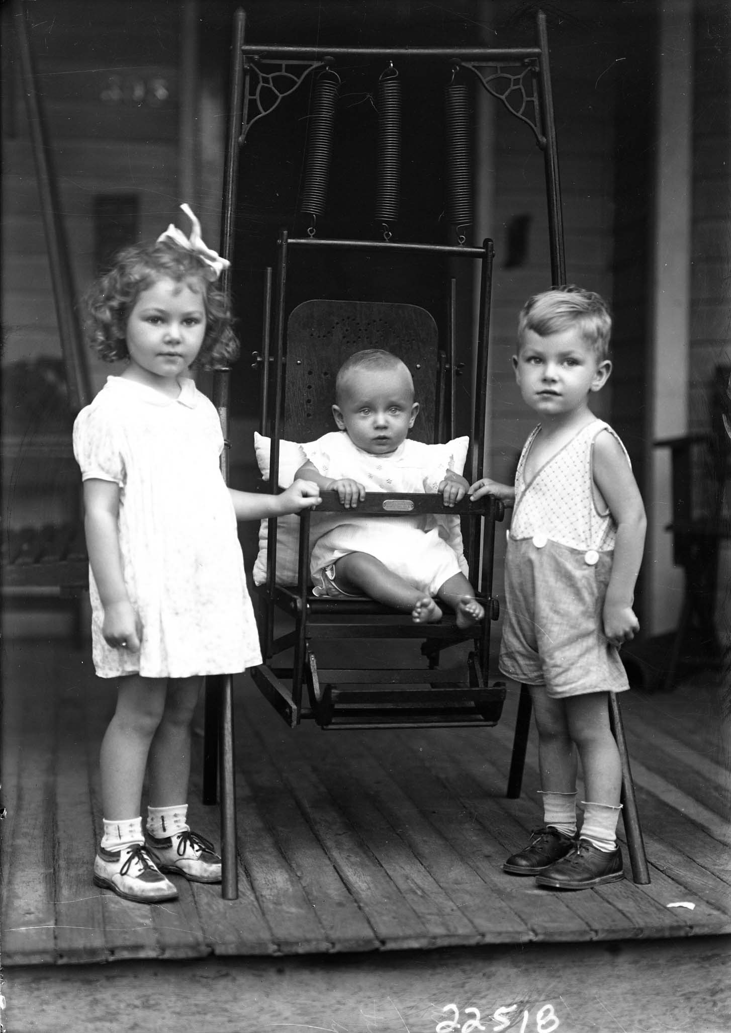 Three unidentified children, a girl with a bow in her curled hair, a barefoot baby in a swing, and a younger boy, are posed together on a porch.