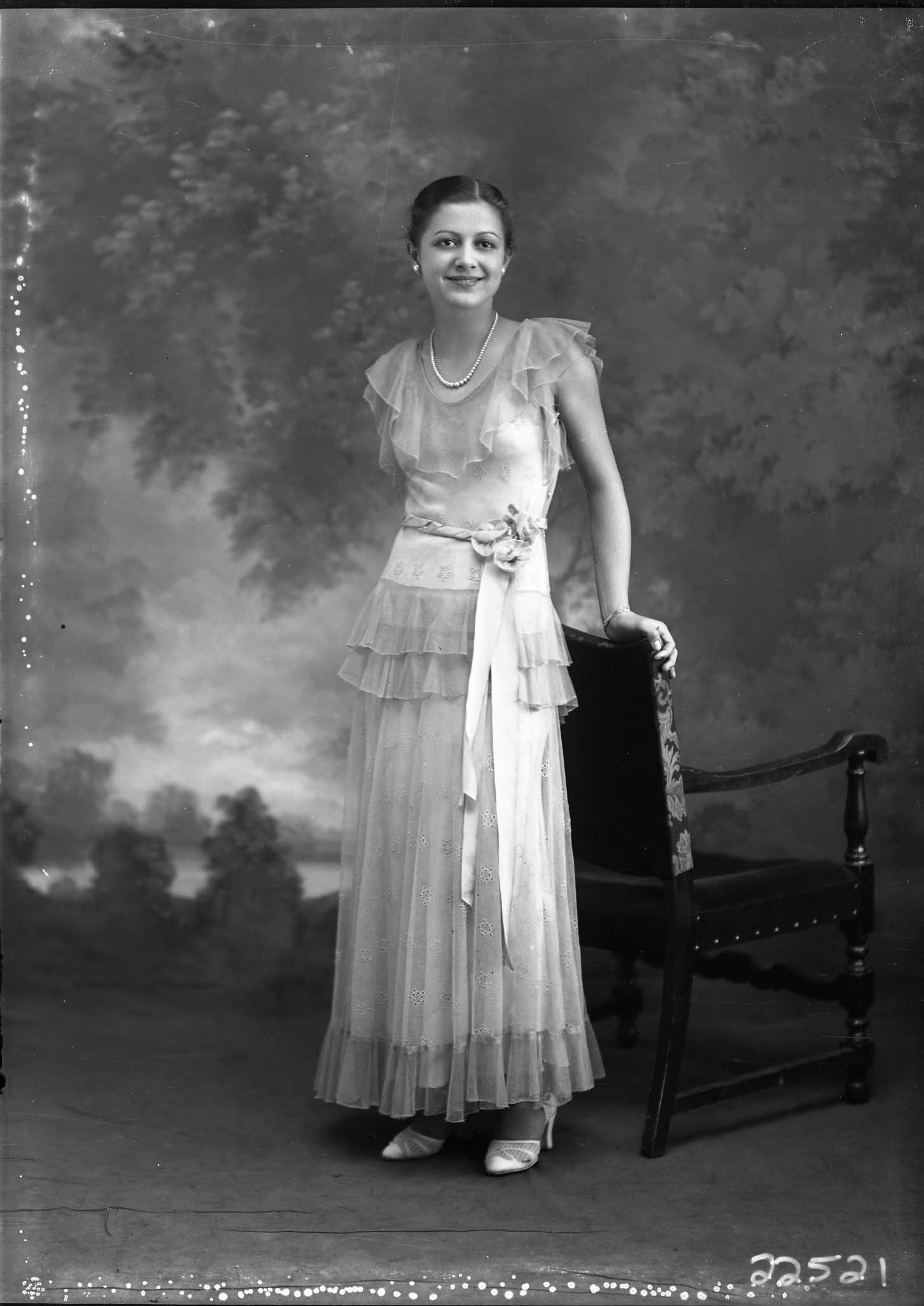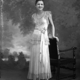 Unidentified woman with her hair pulled back and wearing earrings, a necklace, and a flowered sash with her dress. She is standing by a chair.