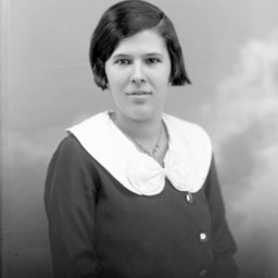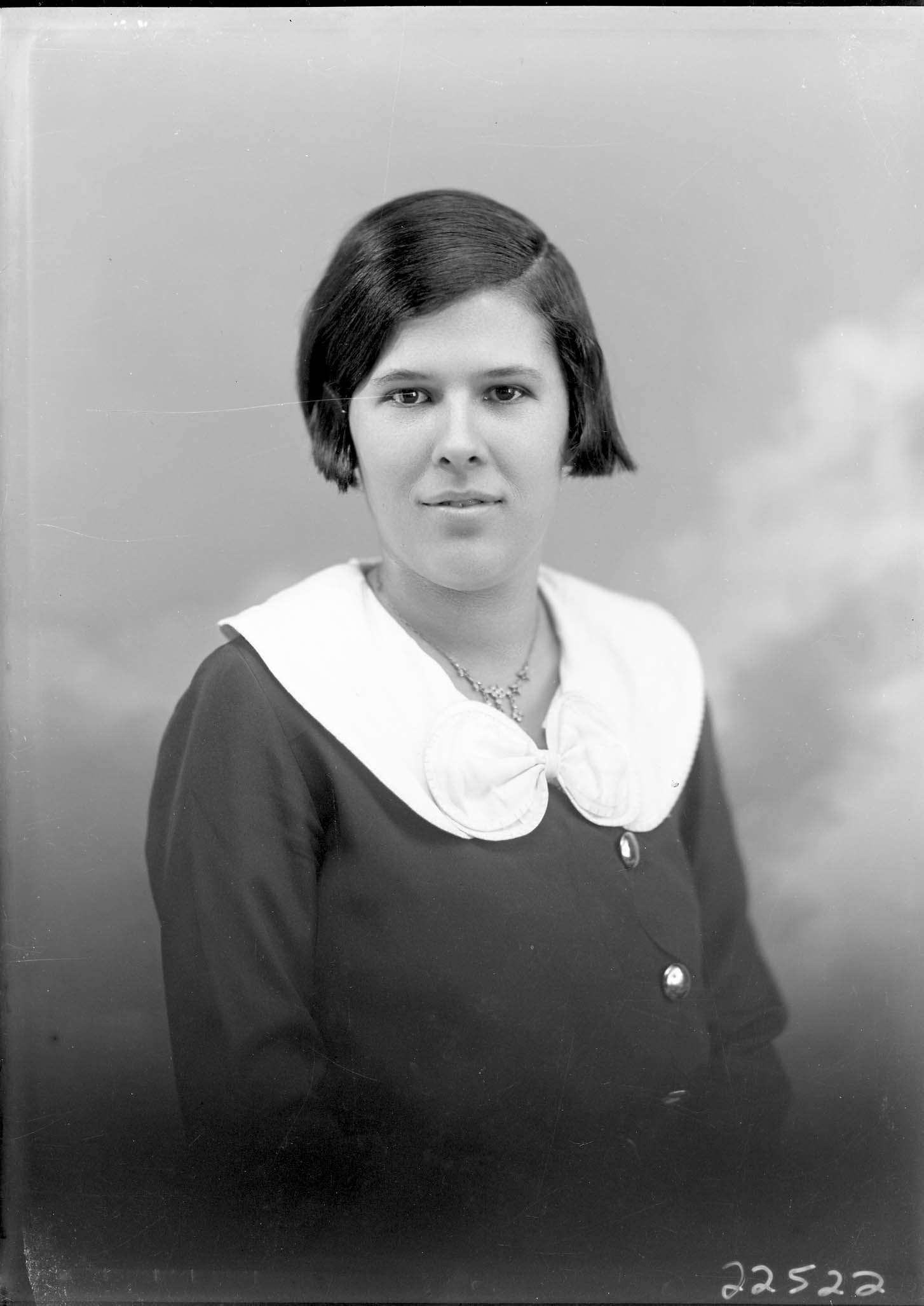 Portrait photograph of an unidentified woman with short hair parted on the side and wearing a wide collar with a bow on her dress.