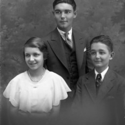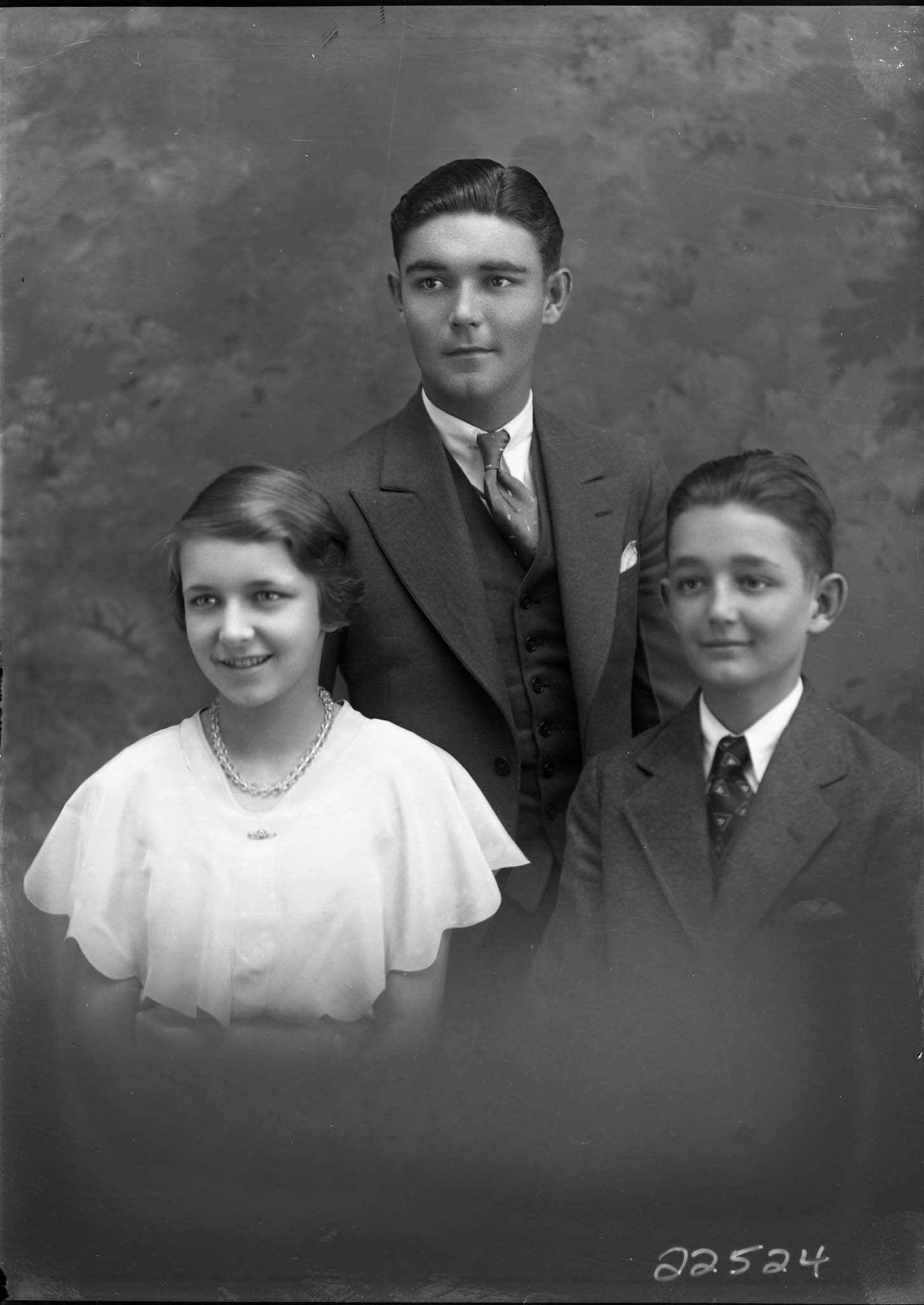 Portrait photograph of three unidentified young people, probably teenaged, posed together. The oldest boy is standing behind a younger girl and boy.