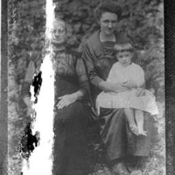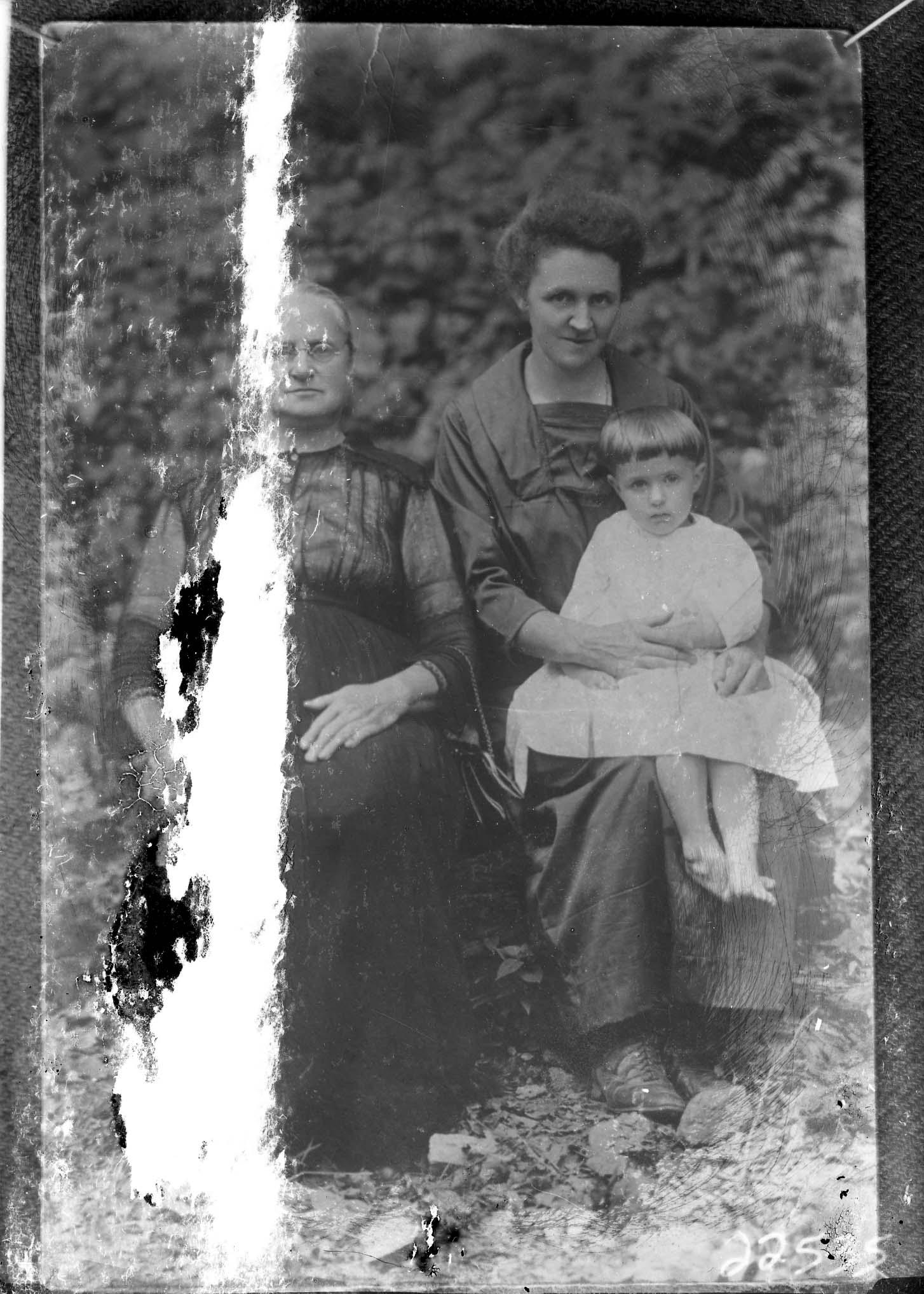 Damaged image of two unidentified women and a barefoot child posed together outdoors.
