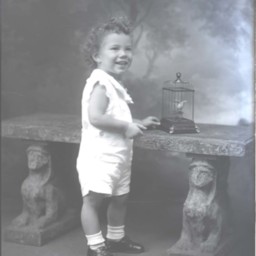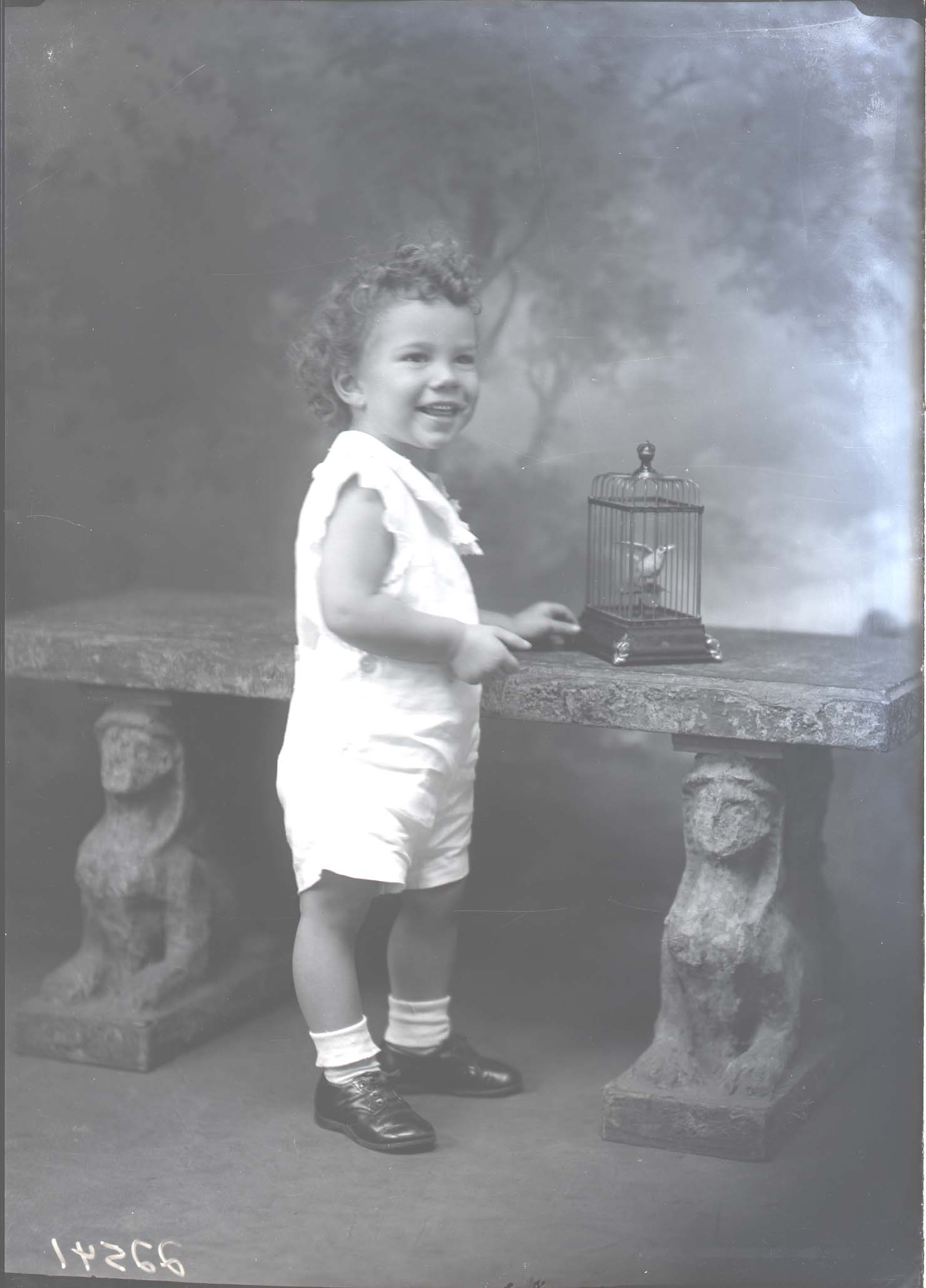 Unidentified young boy standing by a stone bench and a toy bird cage.