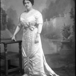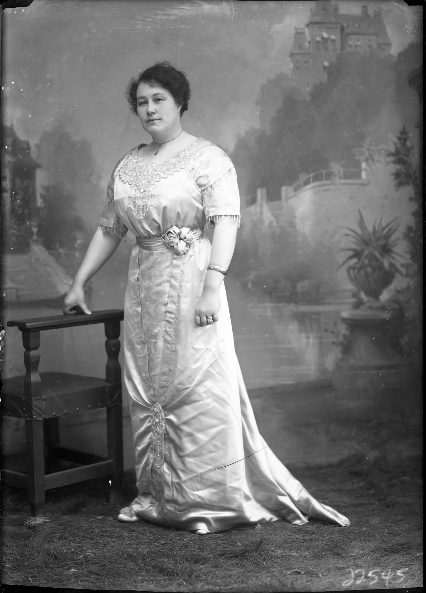 Unidentified woman is standing by a chair and wearing a formal, floor-length gown with a corsage at the waist.