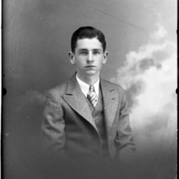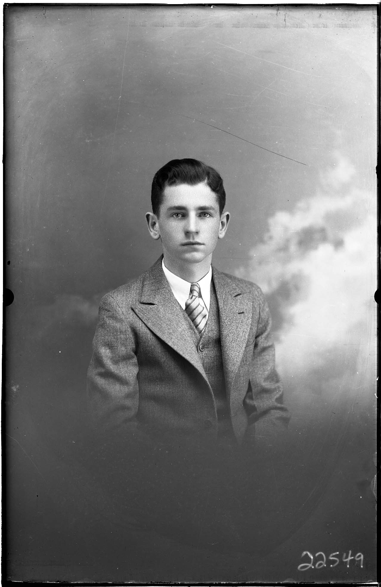 Portrait photograph of an unidentified young man wearing a suit and striped tie.