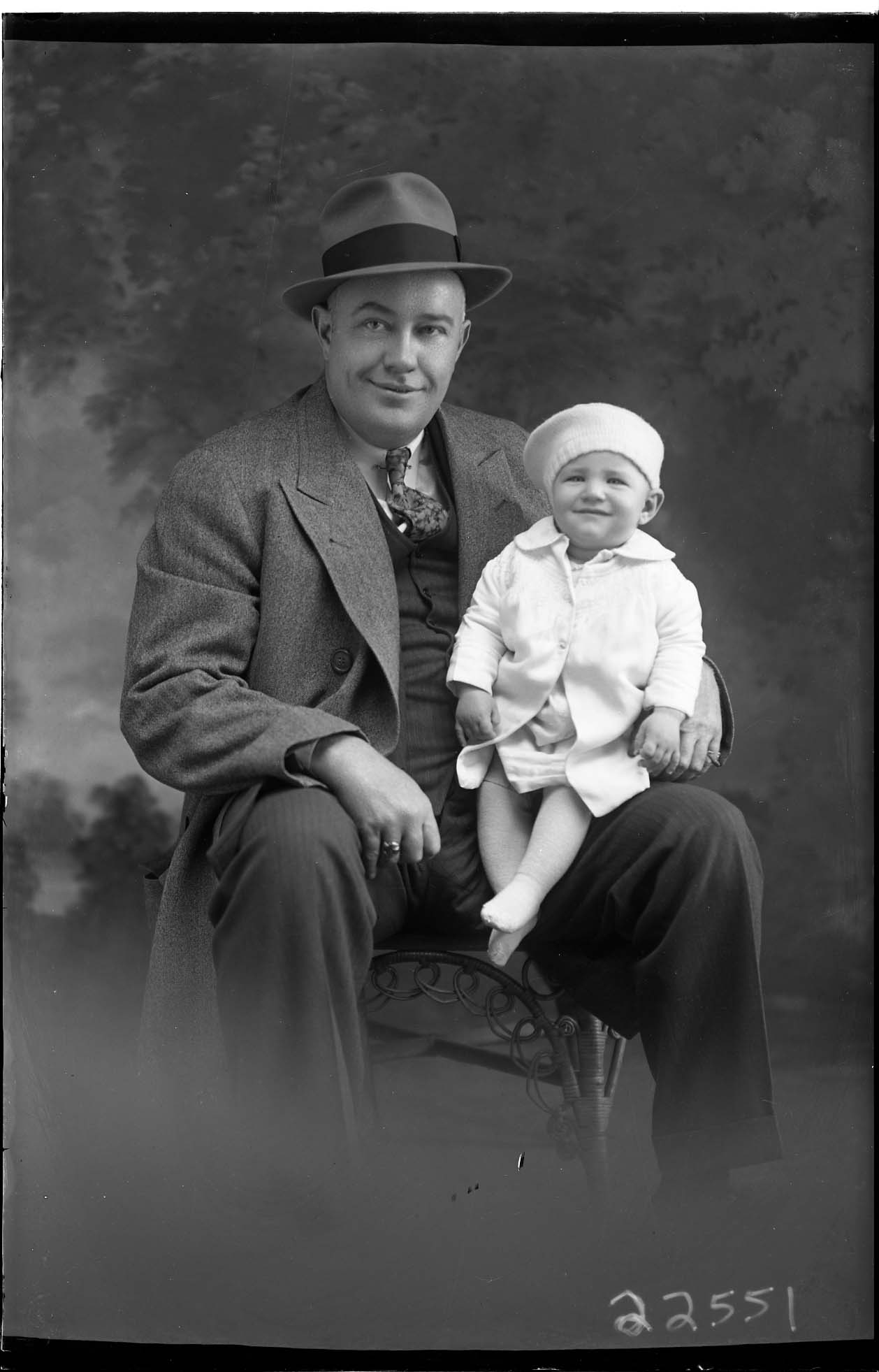 Unidentified man in a hat and suit is seated with an unidentified toddler in a knit hat on his lap.