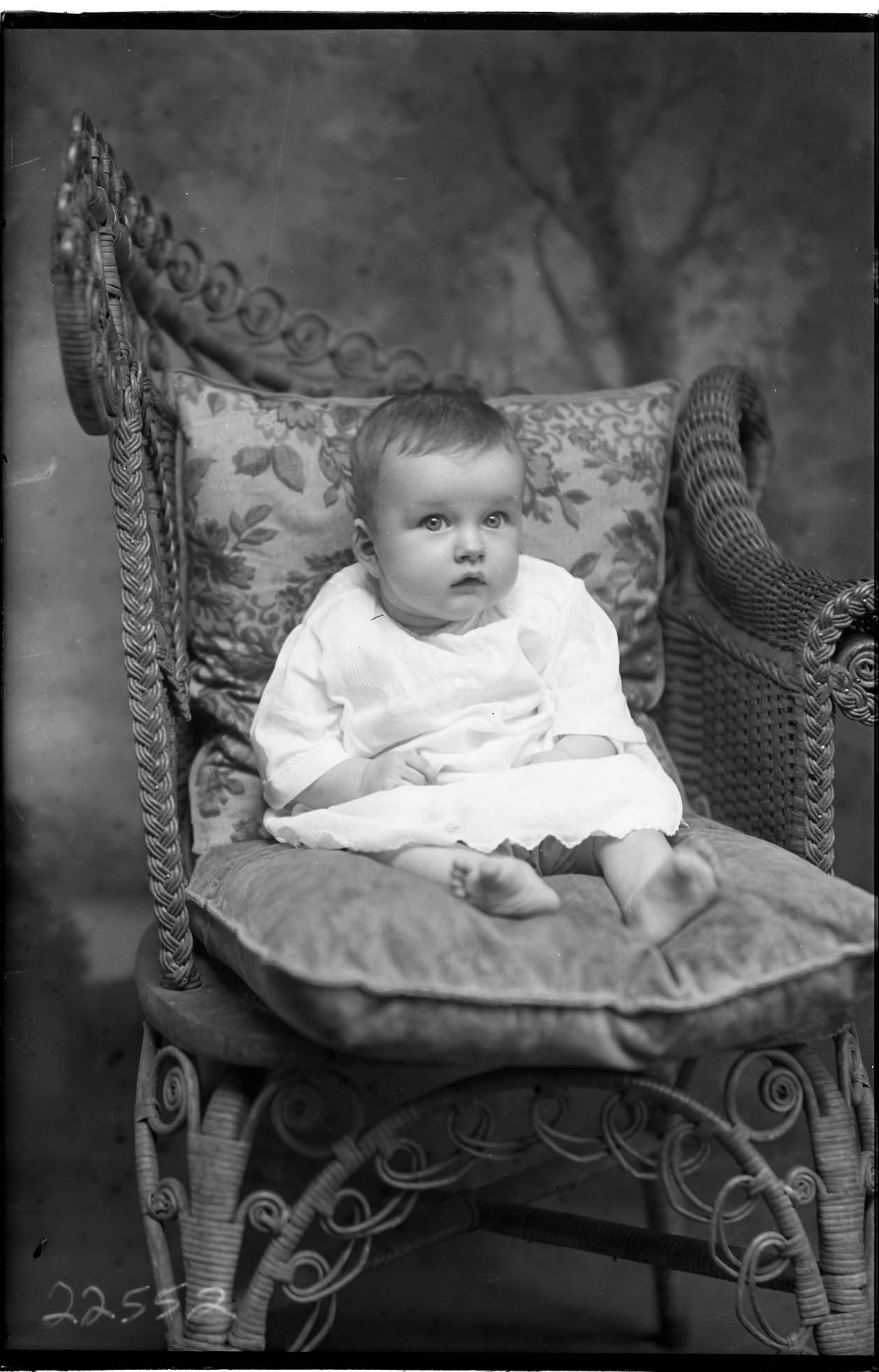 Unidentified barefoot baby is posed on pillows on a wicker chair.