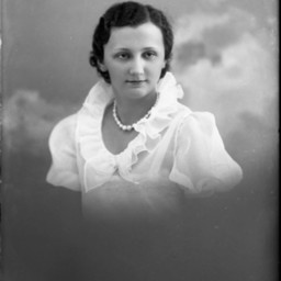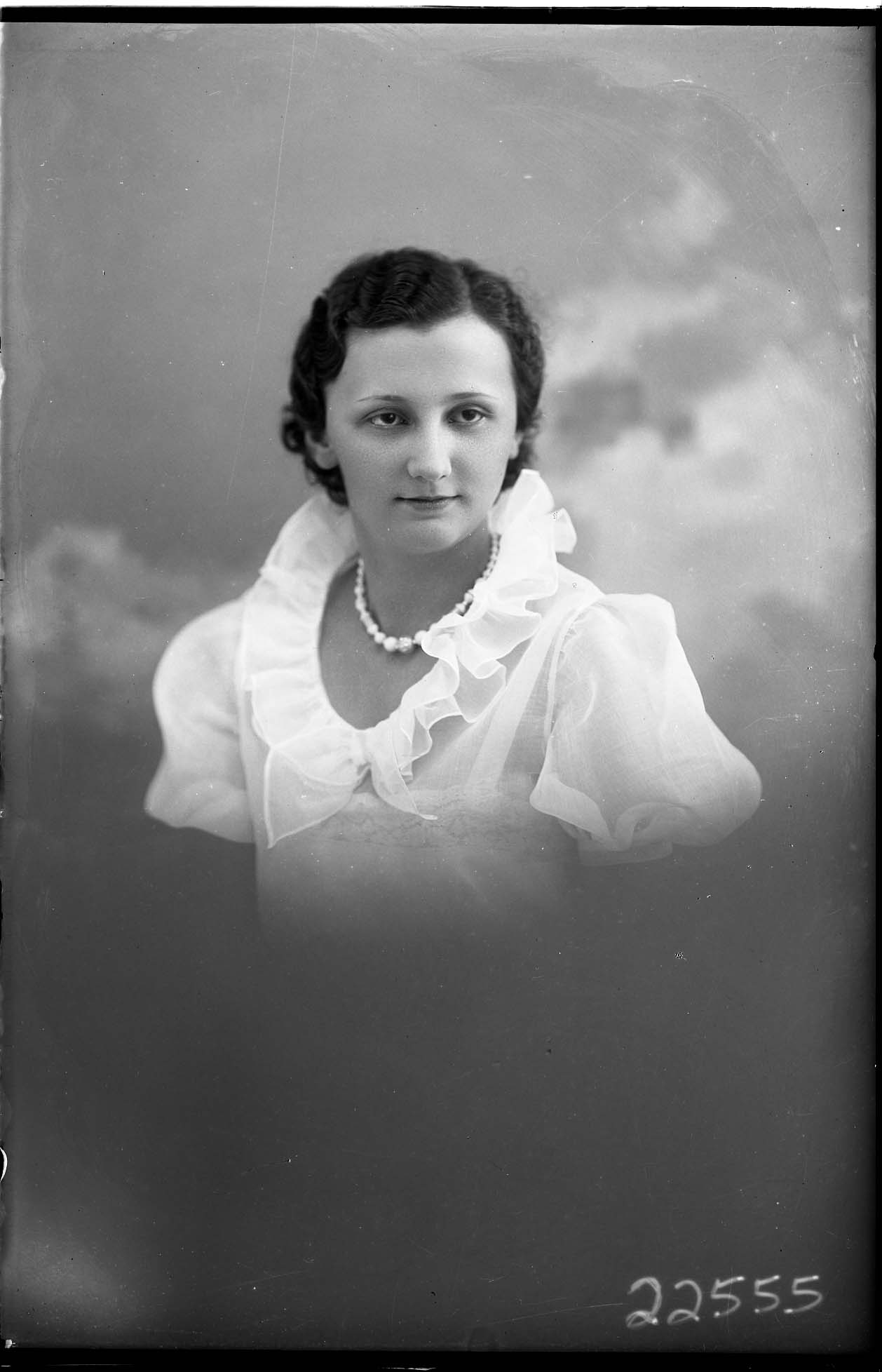 Portrait photograph of an unidentified woman wearing a necklace and a short-sleeved dress with ruffles around the collar.