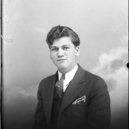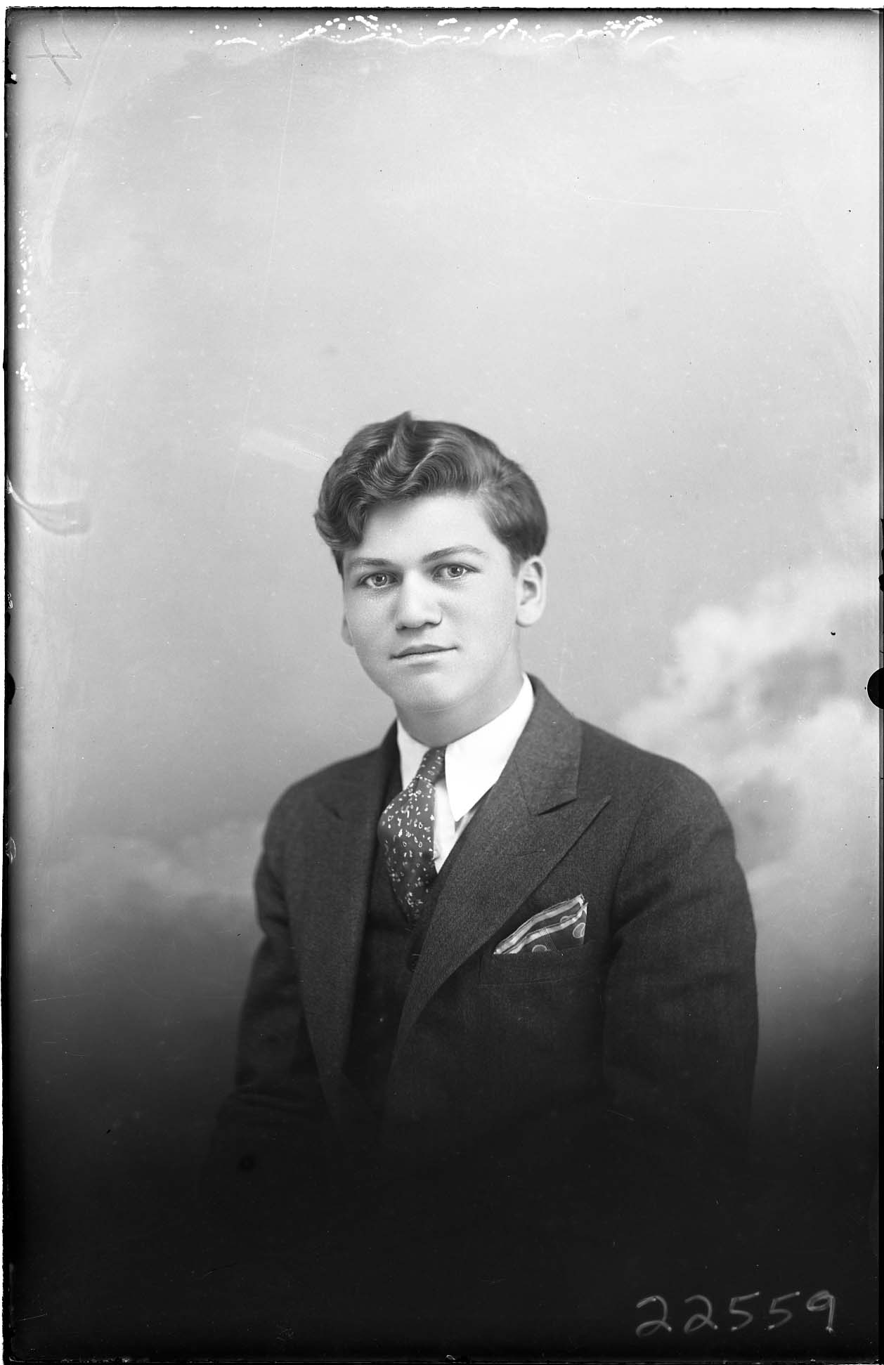 Portrait photograph of an unidentified young man wearing a suit and tie with a handkerchief sticking out of his breast pocket.