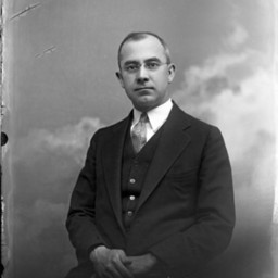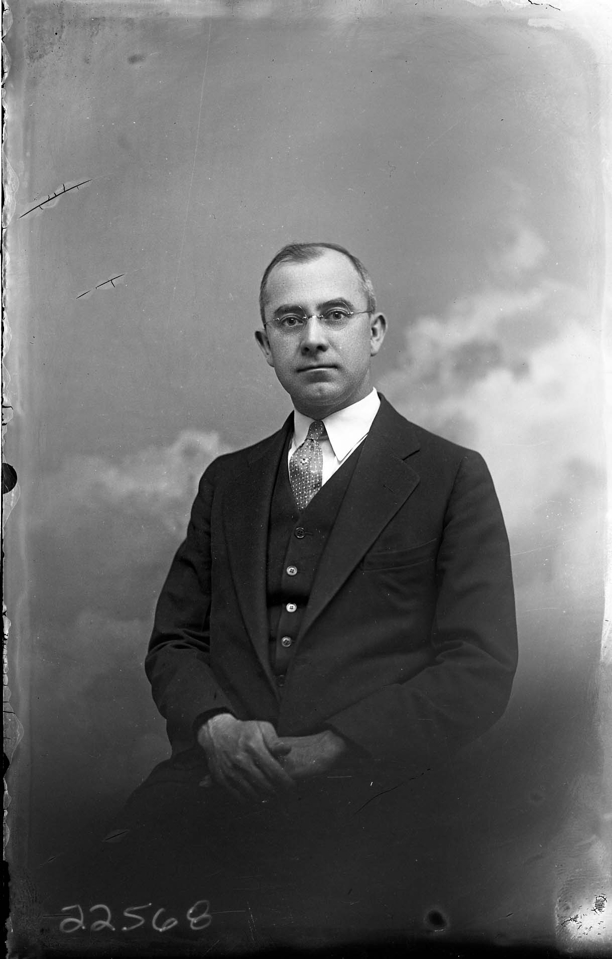 Portrait photograph of an unidentified man with glasses and wearing a suit and polka-dotted tie.