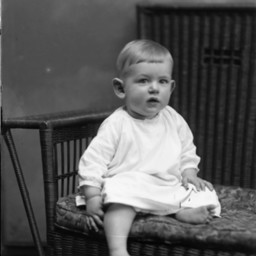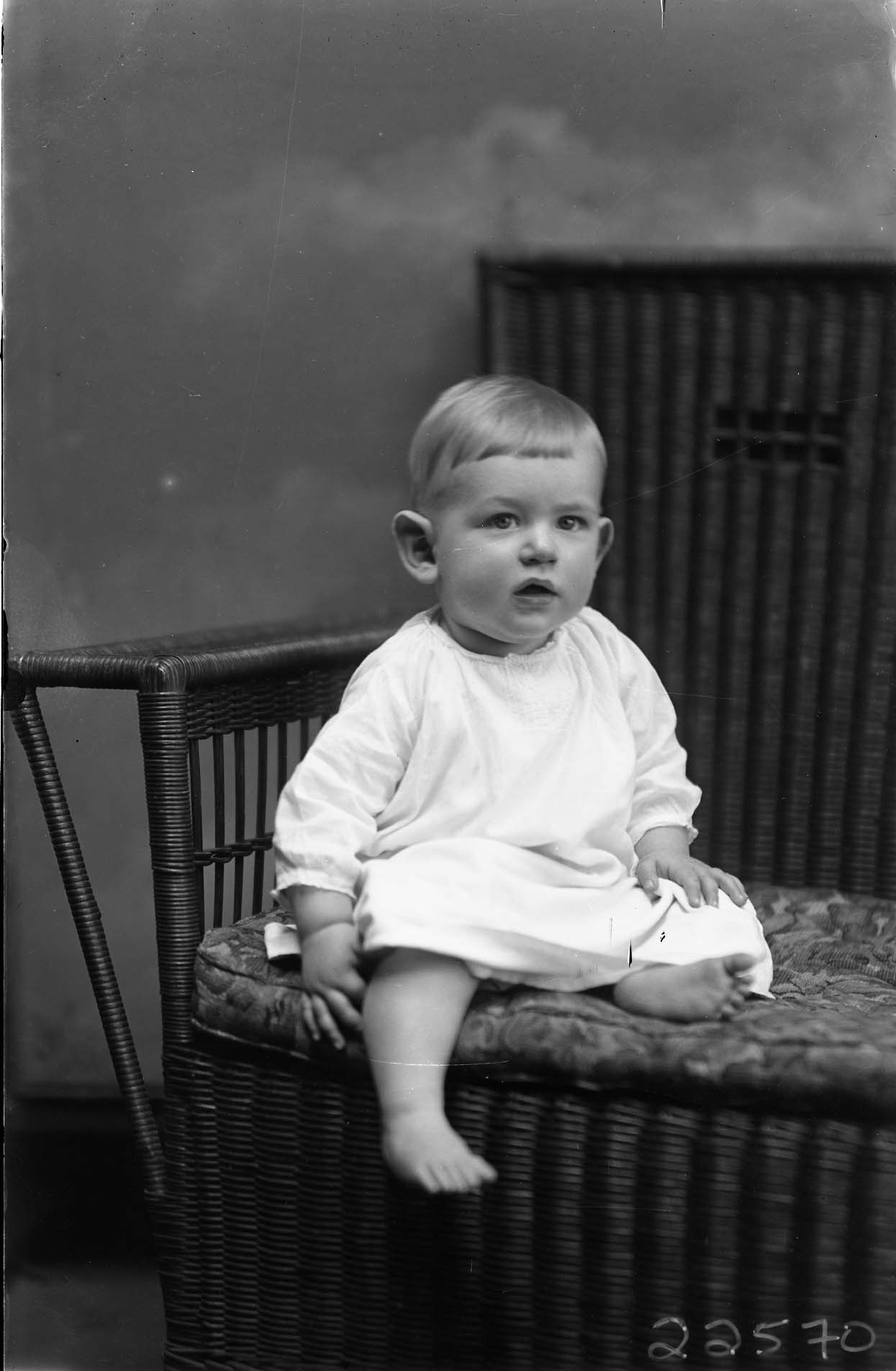 Unidentified barefoot toddler is seated on a wicker chair.