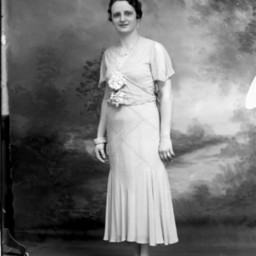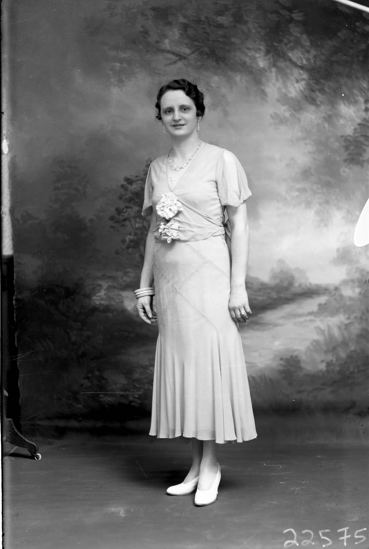 Unidentified woman with wavy hair is wearing earrings, a necklace and a flower on the front of her dress.