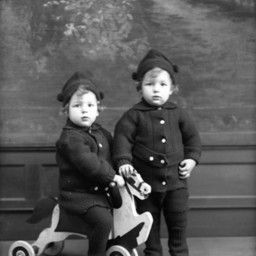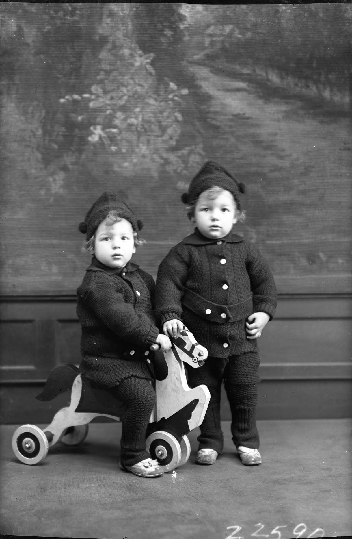 Two unidentified young children, possibly twin boys, are posed together in matching outfits with hats. One is sitting on a hobby horse.
