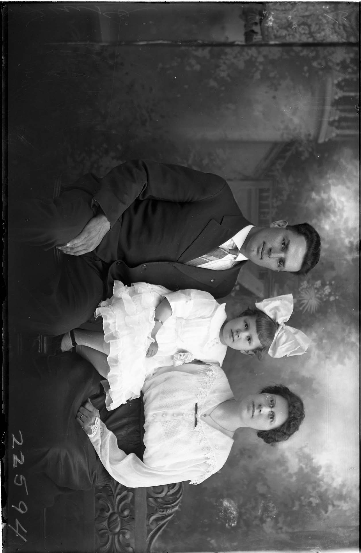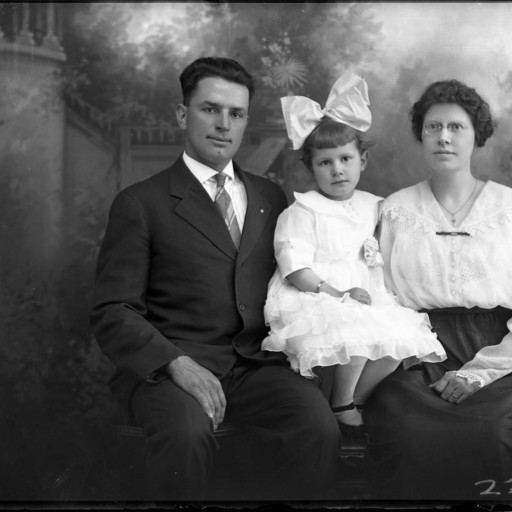 Unidentified man and woman seated together with an unidentified girl with a large bow in her short hair posed between them.