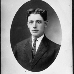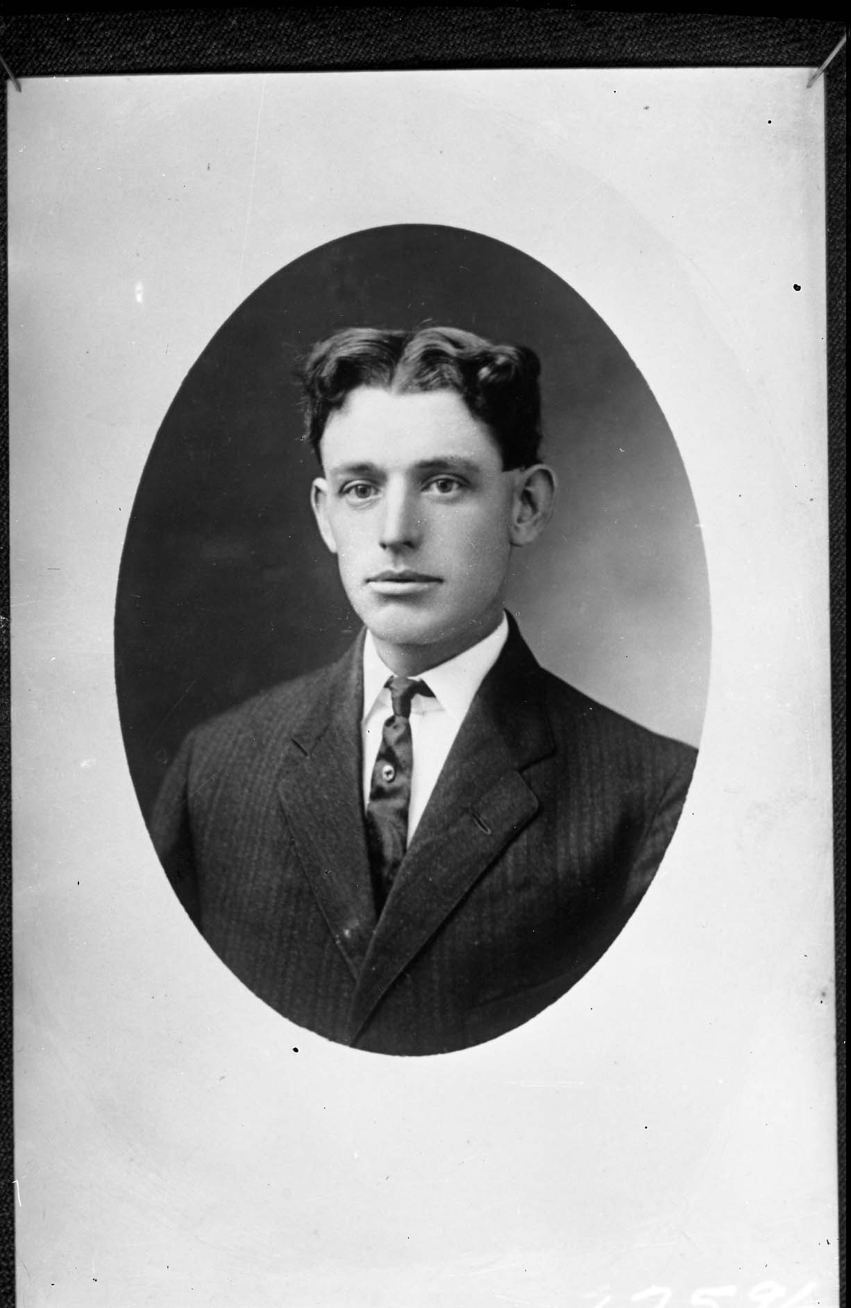 Photo of an oval-framed portrait photograph of an unidentified young man in a suit and tie.