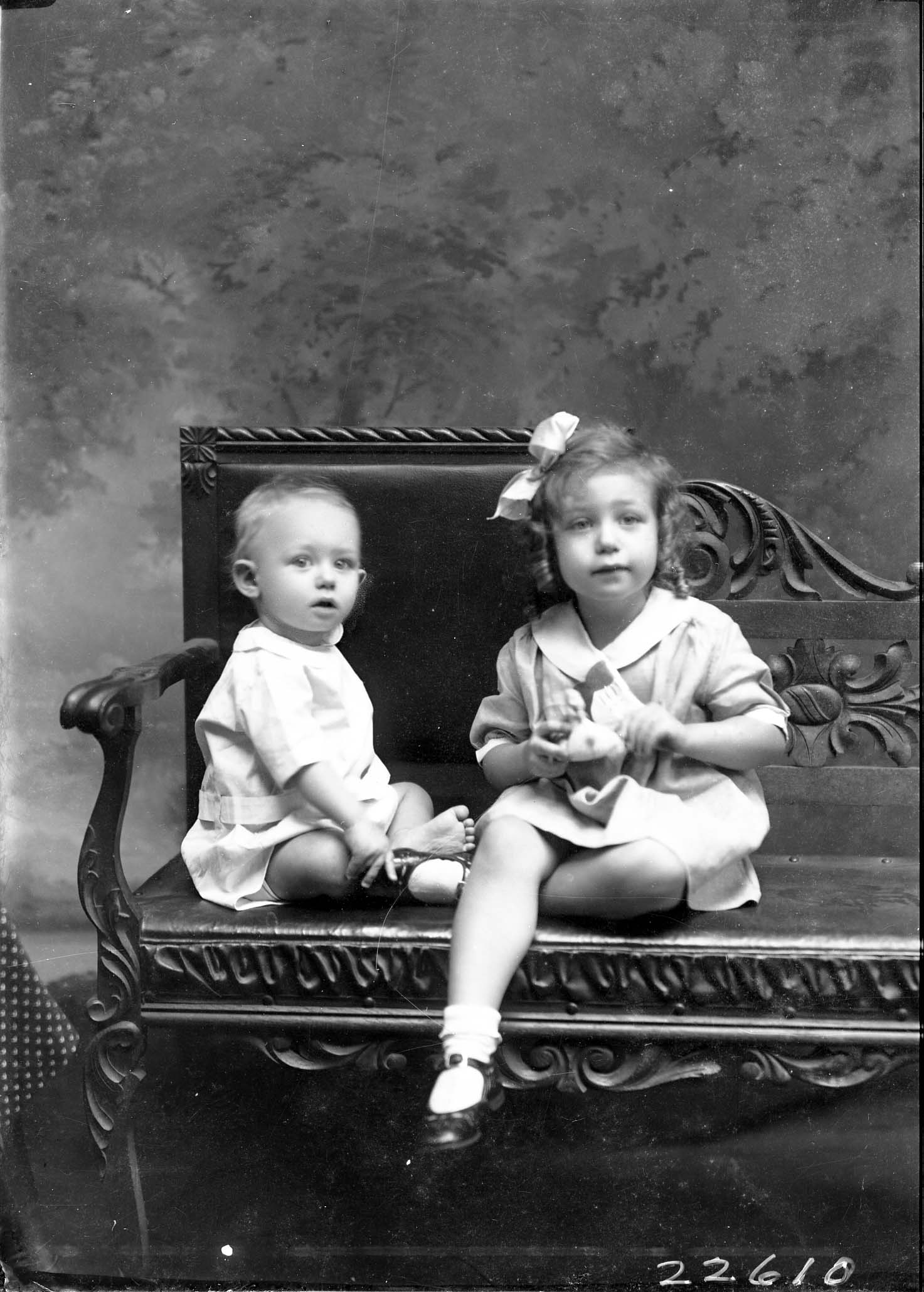 Two unidentified children, a toddler and an older girl with a bow in her hair, are posed together on a bench.