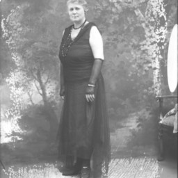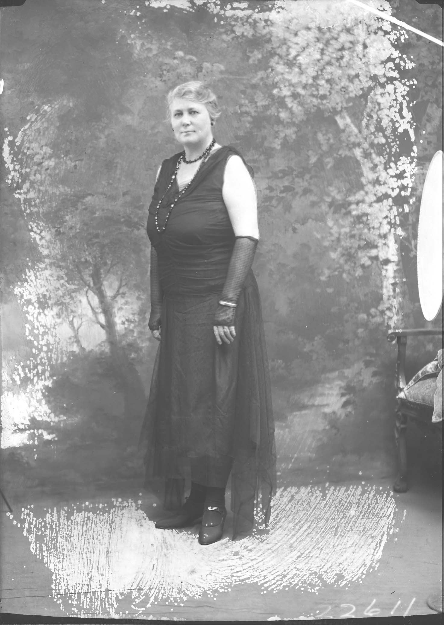 Unidentified woman with her hair pulled back and wearing a necklace and long, fingerless gloves with her formal dress, is standing with her arms at her sides.