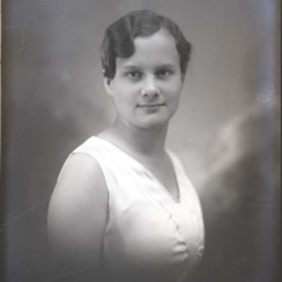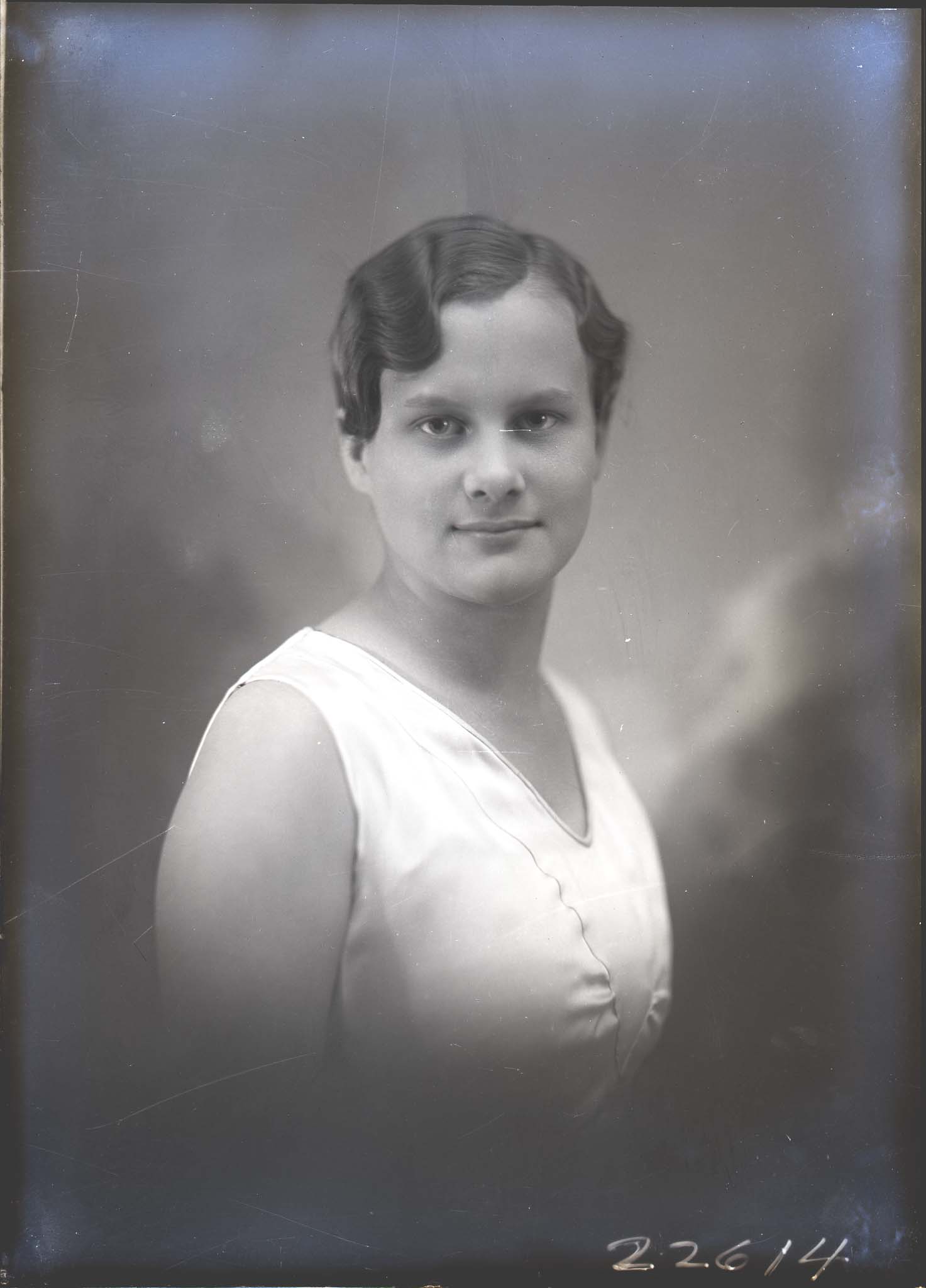 Portrait photograph of an unidentified young woman with short, wavy hair and wearing a sleeveless dress.