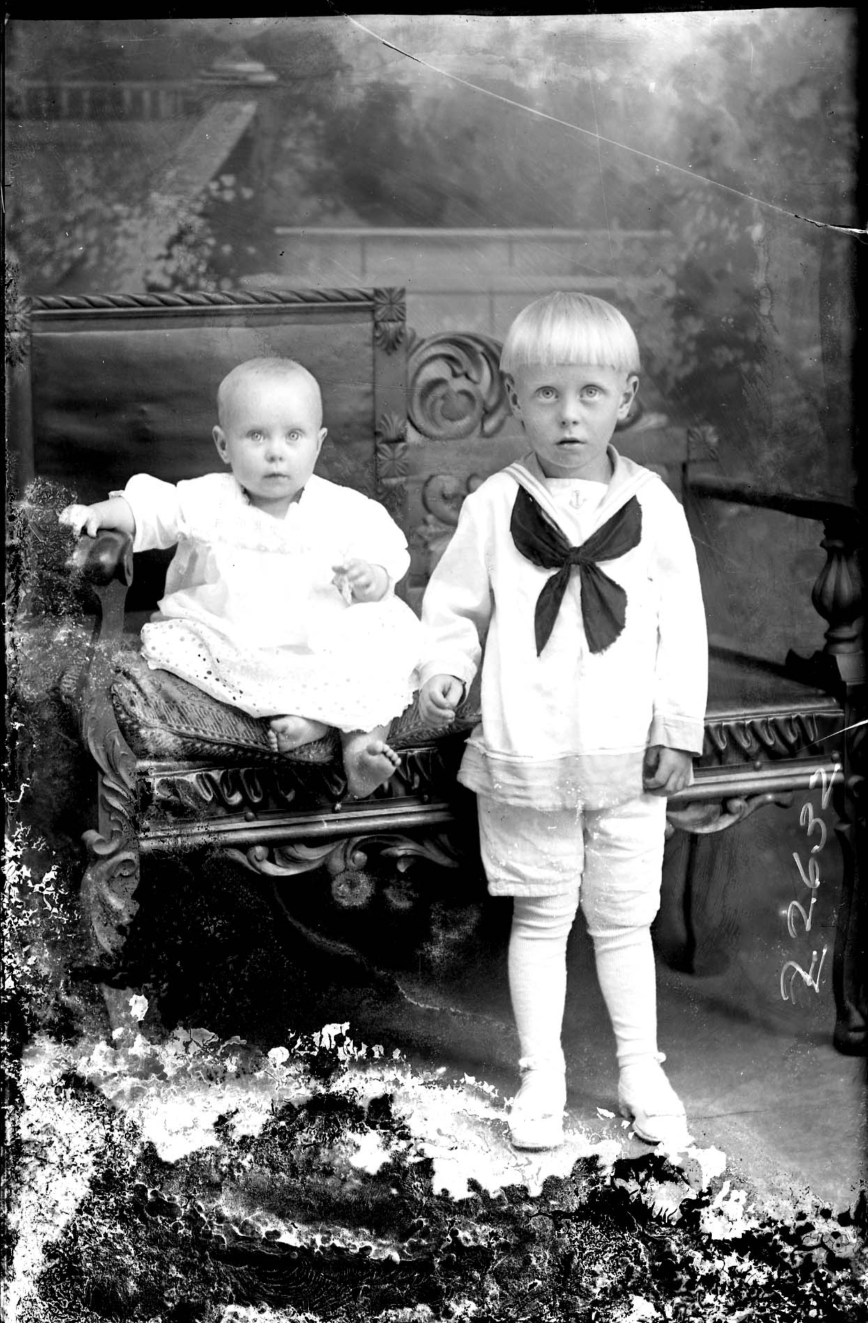 Two unidentified young children, a barefoot baby and a blond boy in a sailor-themed shirt, are posed together on a bench.