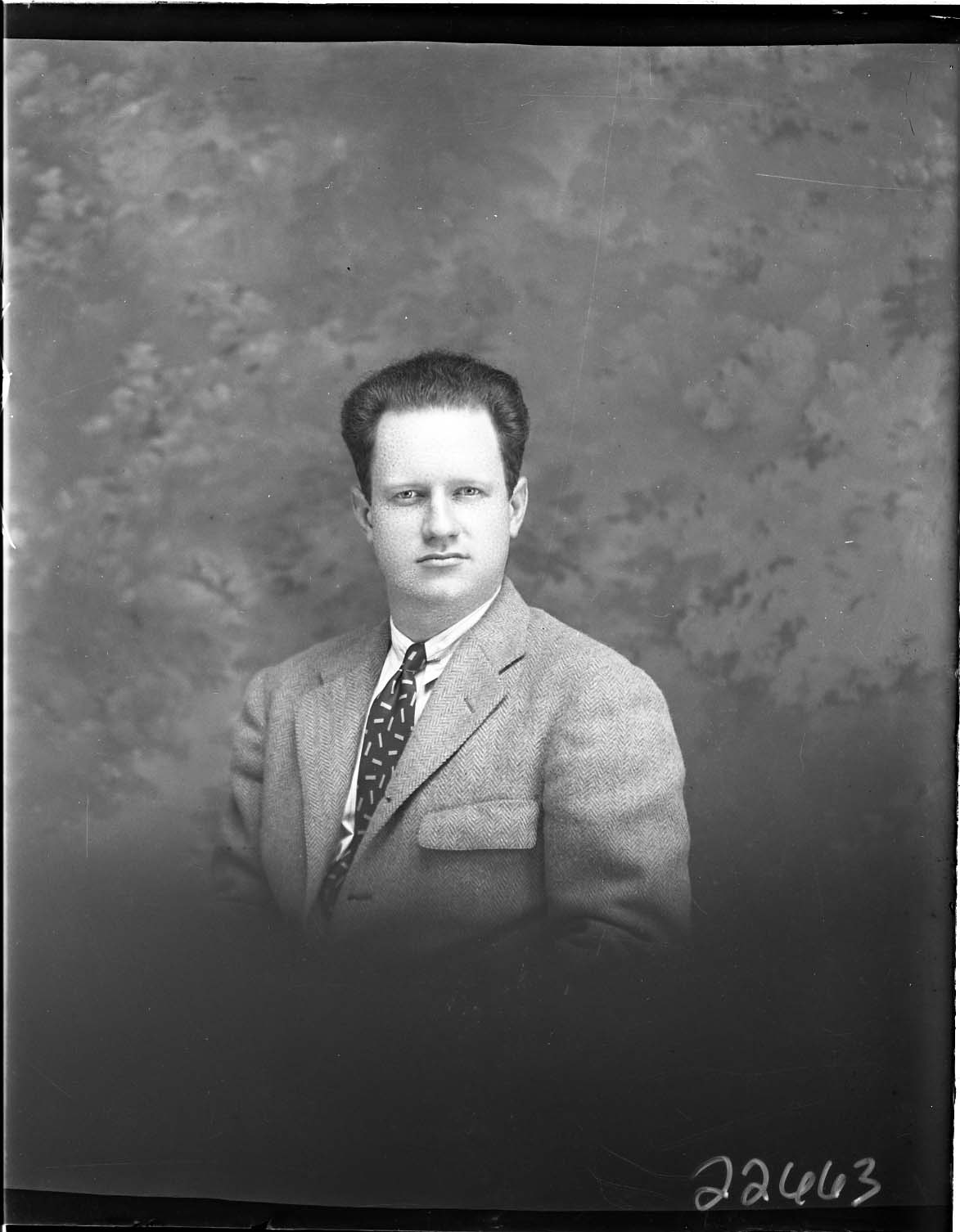 Portrait photograph of an unidentified man wearing a suit and patterned tie.