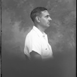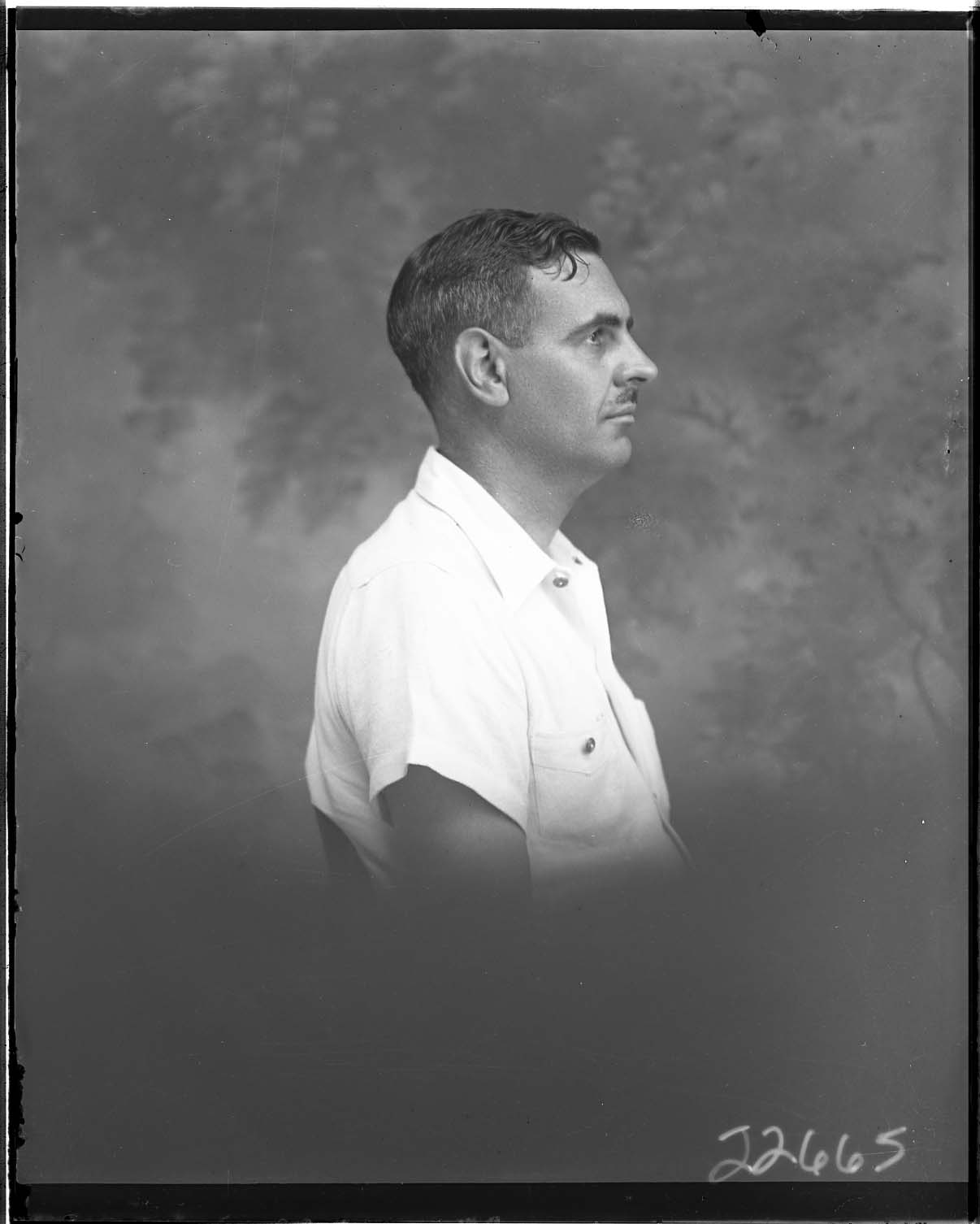 Portrait photograph of an unidentified man shown in profile and wearing a short-sleeved shirt.