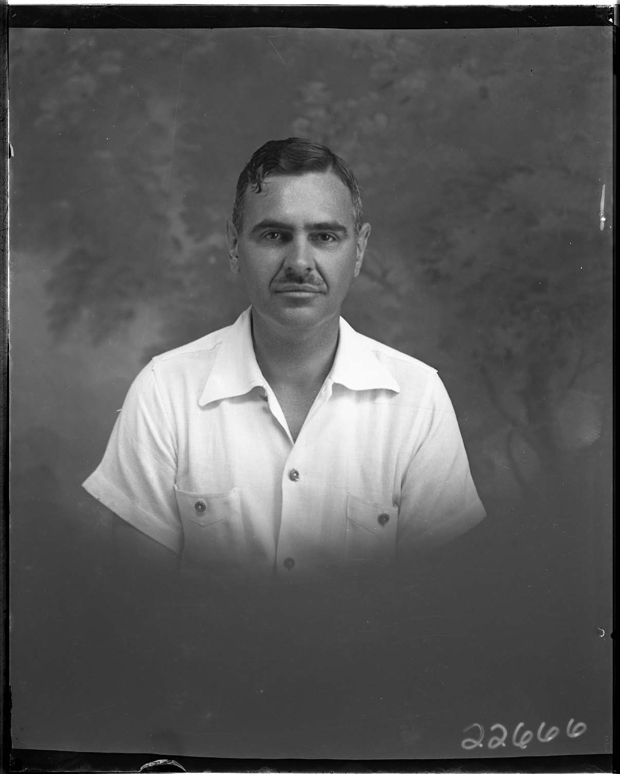 Portrait photograph of an unidentified man with a mustache and wearing a short-sleeved shirt.