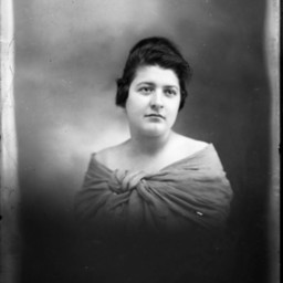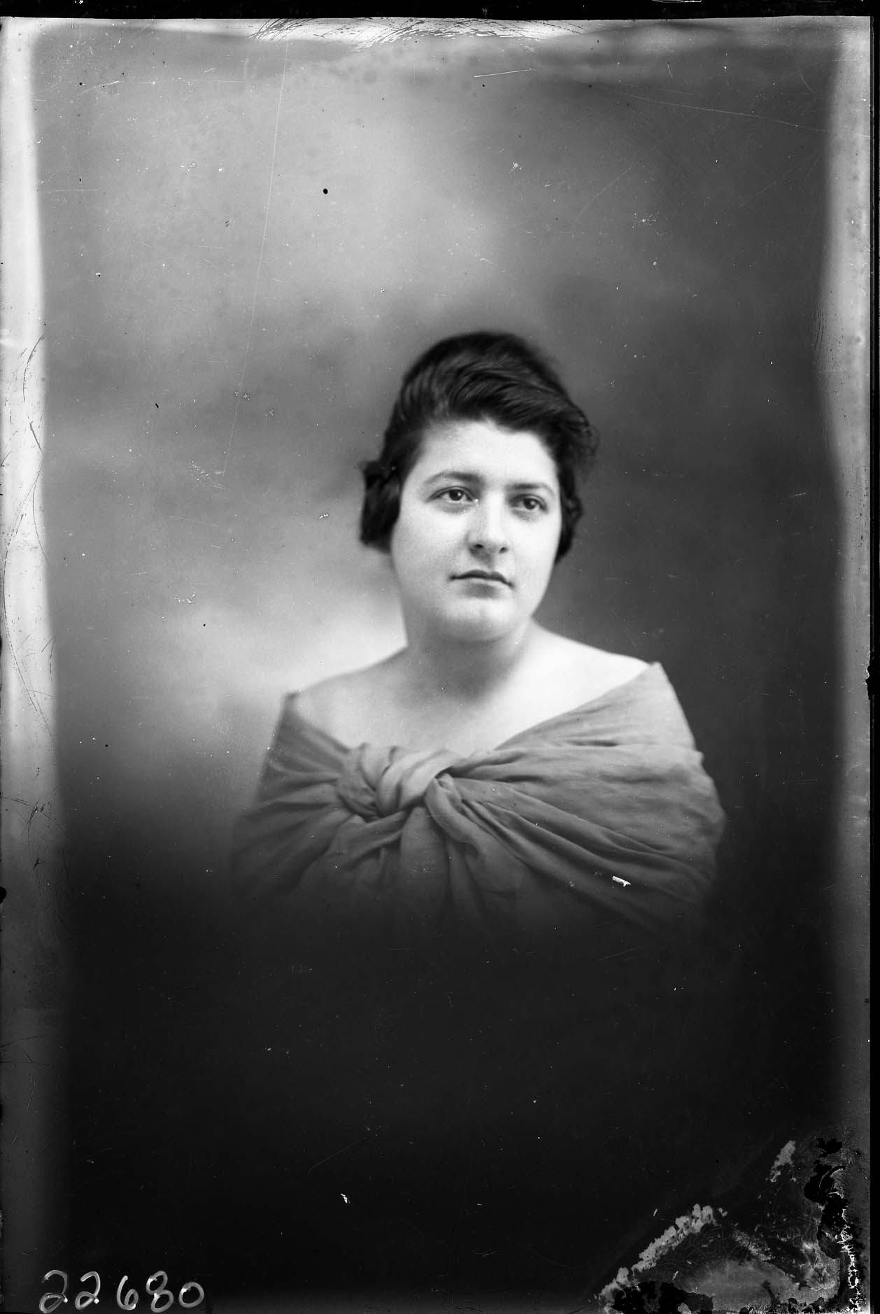 Portrait photograph of an unidentified woman with her hair styled up and wearing a photographer's drape.