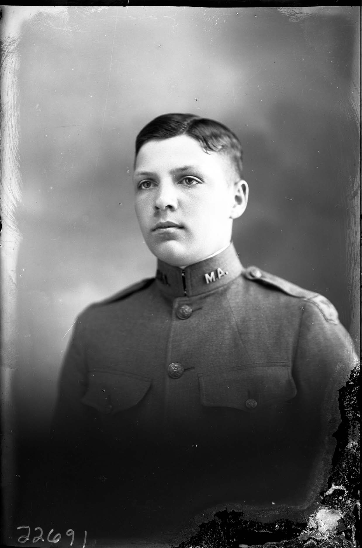 Portrait photograph of an unidentified cadet from Massanutten Military Academy (MMA) wearing his school's uniform.