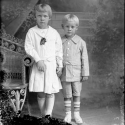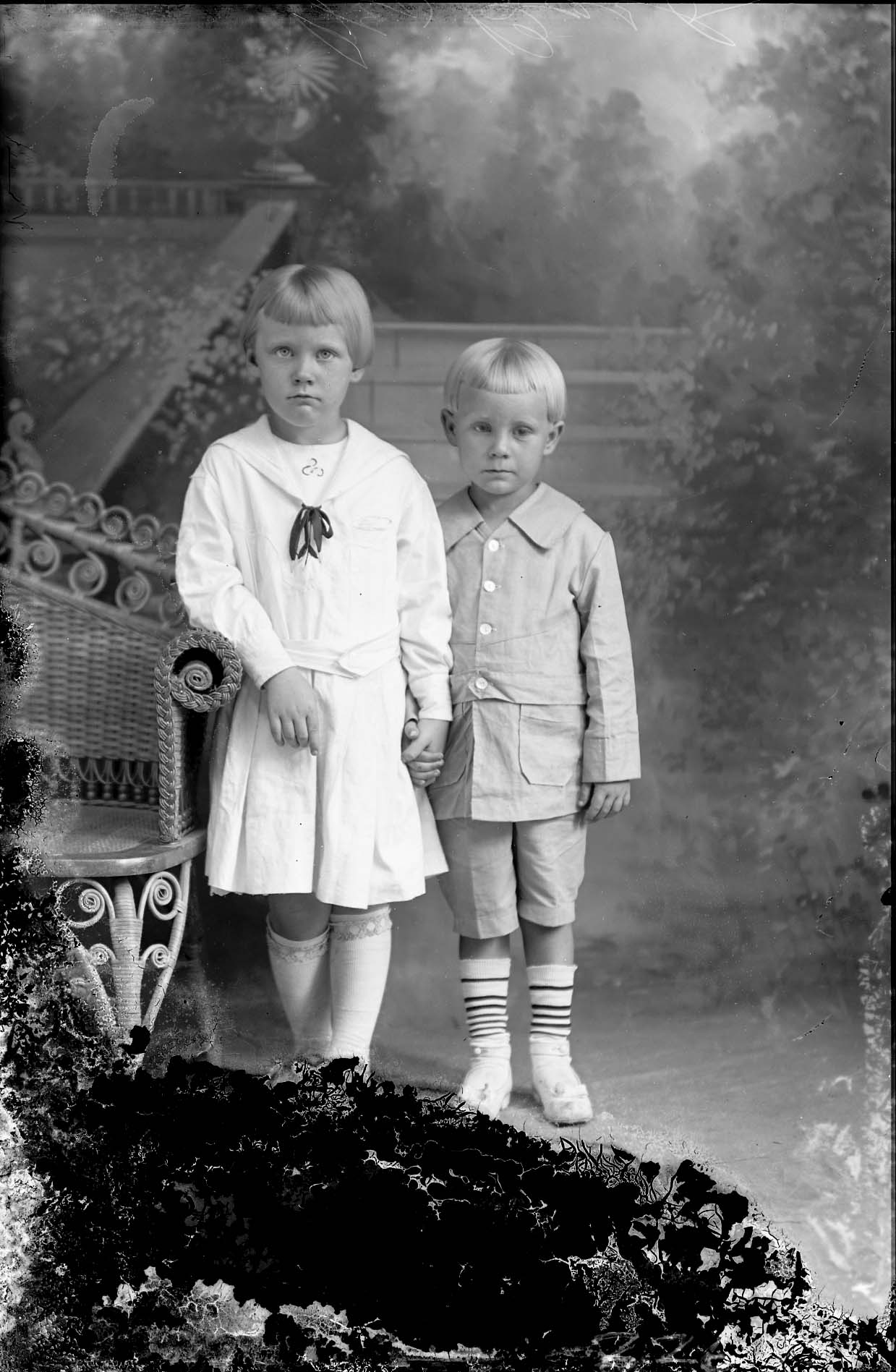 Two unidentified young children, both with short hair and bangs, are posed together and holding hands.