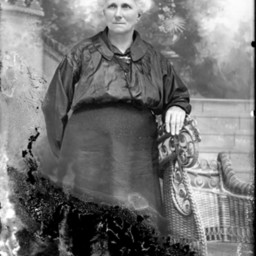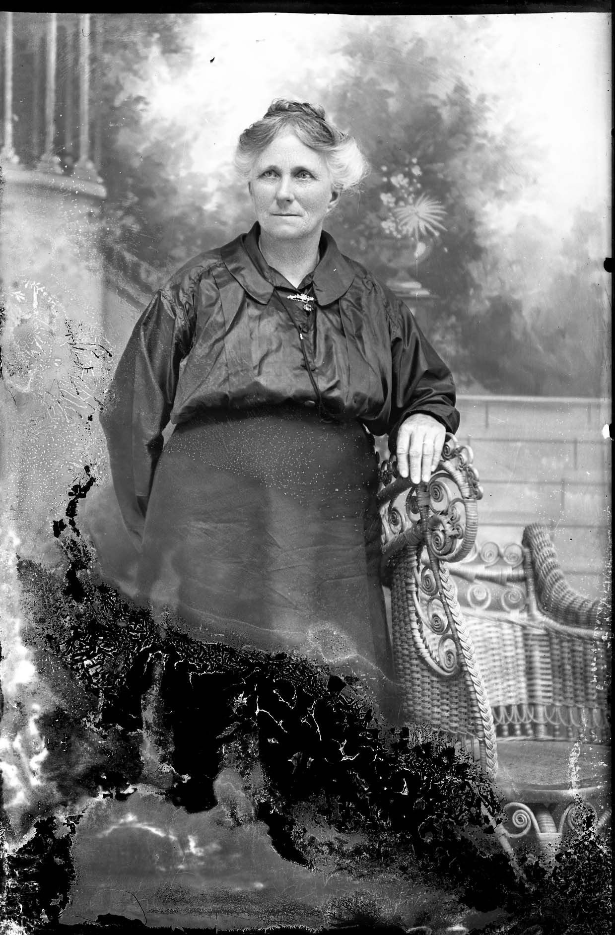 Unidentified older woman is standing by a wicker chair with one hand behind her back.