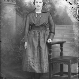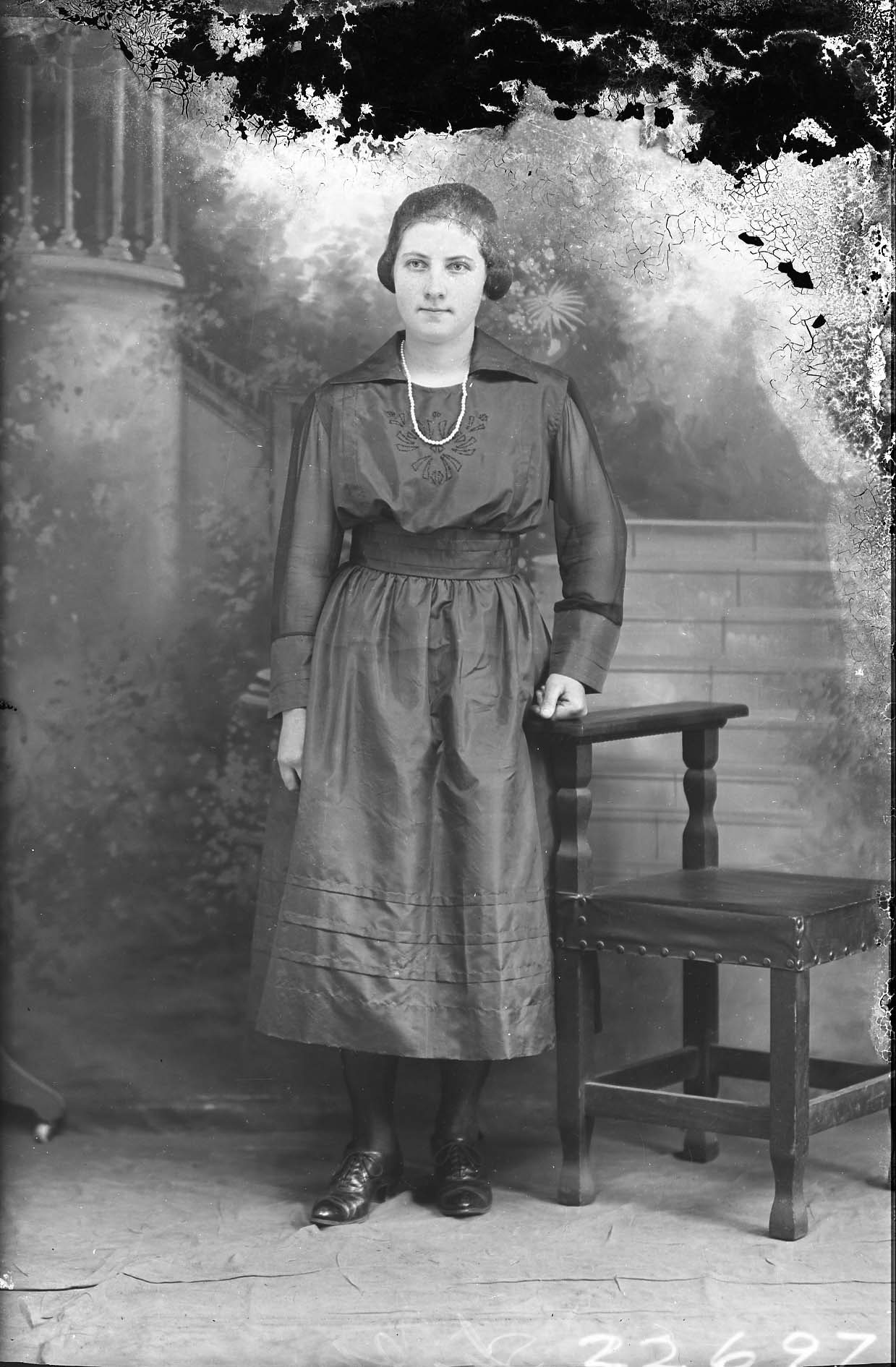 Unidentified young woman wearing a faux pearl necklace and a long-sleeved dark dress, is standing by a chair.
