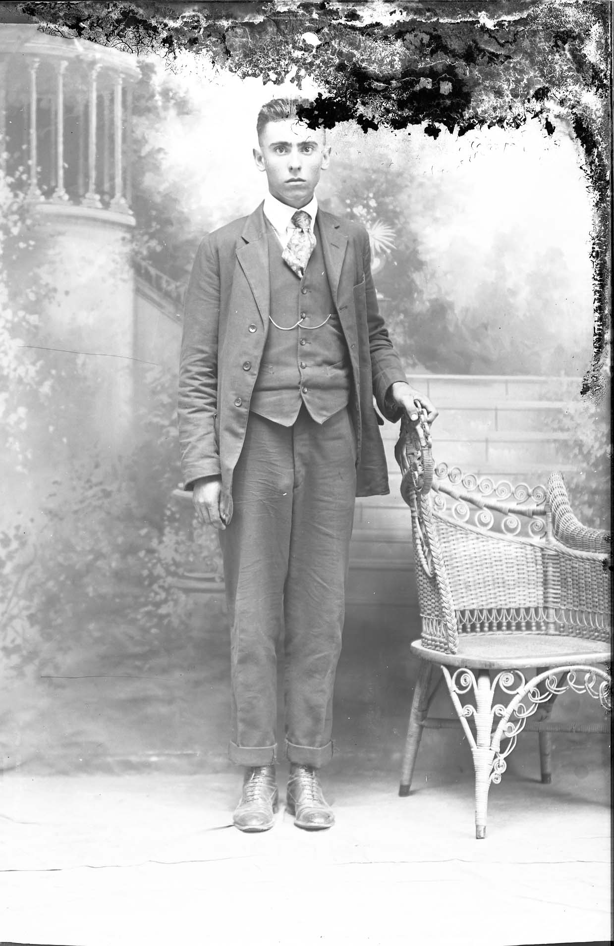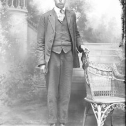 Unidentified man in a suit, vest, and tie is standing by a wicker chair.