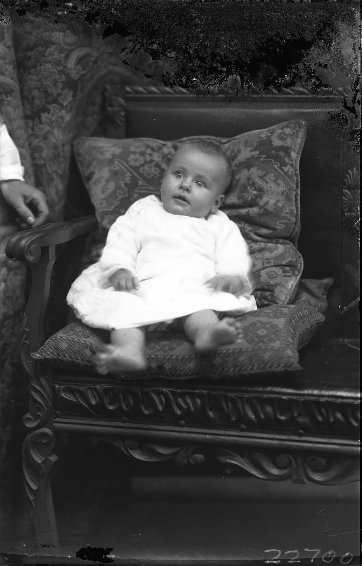 Unidentified barefoot baby is posed against pillows on a bench.